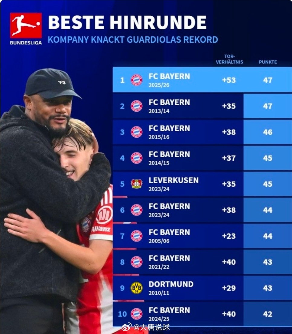 拜仁打破德甲历史纪录:上半赛季拿到47分、净胜球53球德国转会市场盘点了德甲历史半程赛季积分情况,本赛季拜仁在上半赛季拿到47分,净胜球+53球,打破联赛纪录。德甲历史半程赛季积分&净胜球排名:1、拜仁(25/26赛季)——净胜球+53,积分472、拜仁(13/14赛季)——净胜球+35,积分473、拜仁(15/16赛季)——净胜球+38,积分464、拜仁(14/15赛季)——净胜球+37,积分455、勒沃库森(23/24赛季)——净胜球+35,积分456、拜仁(23/24赛季)——净胜球+38,积分447、拜仁(05/06赛季)——净胜球+23,积分448、拜仁(21/22赛季)——净胜球+40,积分439、多特蒙德(10/11赛季)——净胜球+29,积分4310、拜仁(24/25赛季)——净胜球+40,积分42