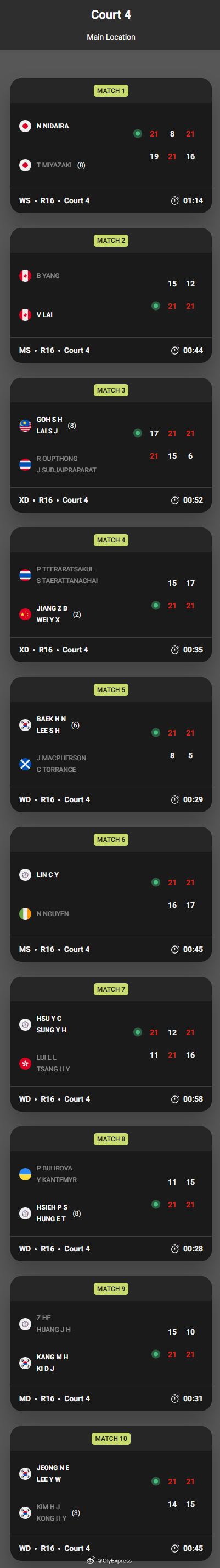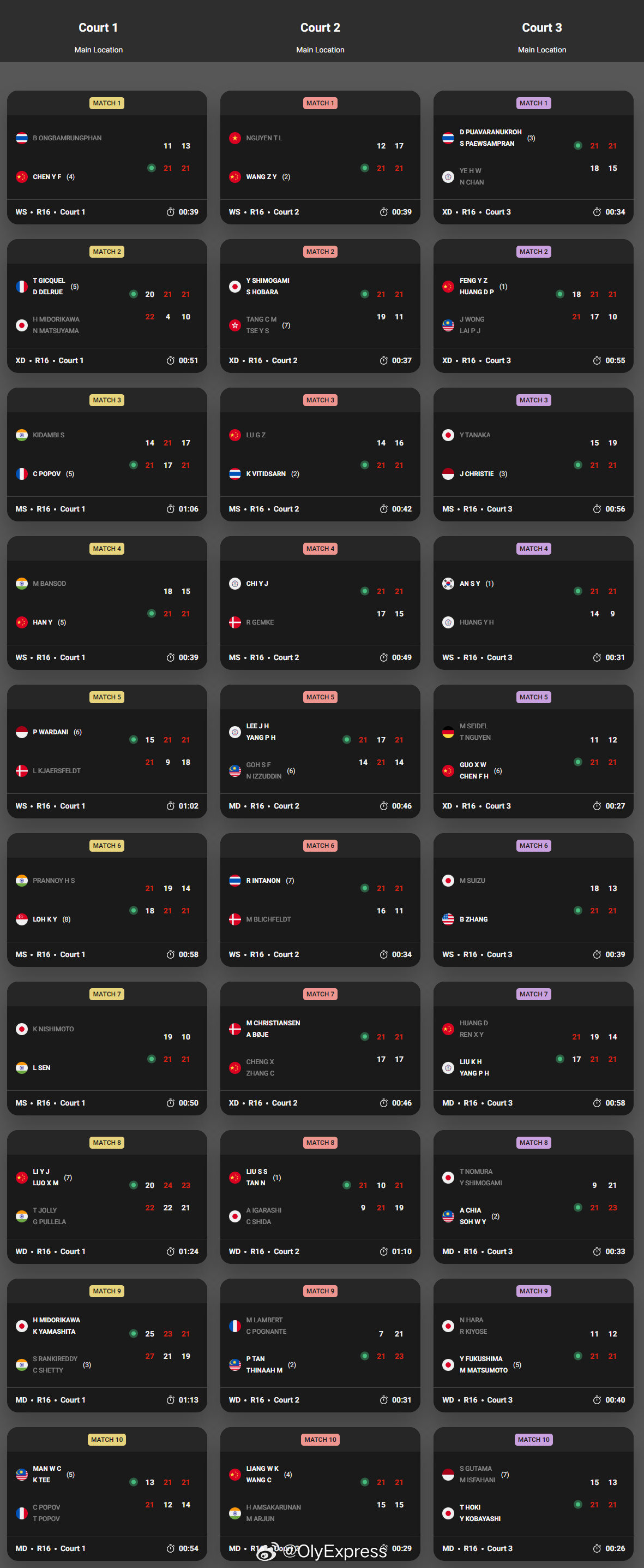 【印度赛次轮国羽9胜3负 男单全军覆没】2026年印度羽毛球公开赛羽联超级赛1月15日新德里,2026世界羽联超级750印度公开赛进入第二轮,国羽取得9胜3负战绩,男单在独苗陆光祖止步后已经全军覆没。国羽赛果如下:男单:陆光祖14-21/16-21昆拉武特(泰国)女单:韩悦21-18/21-15班索德(印度)陈雨菲21-11/21-13布桑南(泰国)王祉怡21-12/21-17阮翠灵(越南)男双:梁伟铿/王昶21-1521-15/阿姆萨卡鲁南/阿俊(印度)黄荻/任翔宇21-17/19-21/14-21刘广珩/杨博涵(中国台北)女双:刘圣书/谭宁21-9/10-21/21-19五十岚有纱/志田千阳(日本)李怡婧/罗徐敏20-22/24-22/23-21乔利/普莱拉(印度)混双:冯彦哲/黄东萍18-21/21-17/21-10黄显维/赖沛君(马来西亚)蒋振邦/魏雅欣21-15/21-17特拉拉特萨库尔/沙西丽(泰国)郭新娃/陈芳卉21-11/21-12塞德尔/阮淑芳(德国)程星/张驰17-21/17-21克里斯蒂安森/博耶(丹麦)