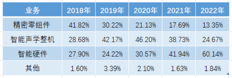 但由此带来资产减值17.97亿元,导致2022年归母净利润下滑59.08%,其中智能声学整机产品营收占比也从38.73%降至24.67%。