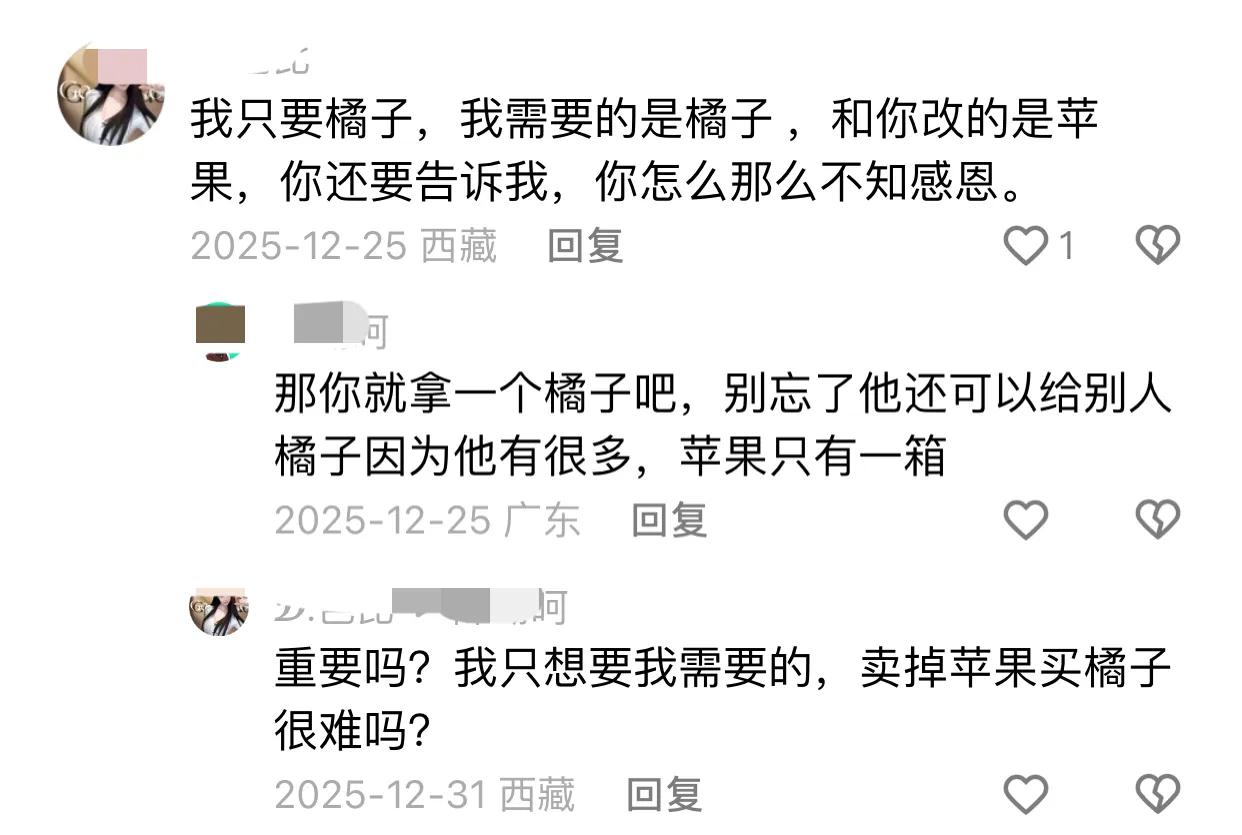 正方辩手:我想吃橘子,你却给了我一箱苹果。这就好像我把正确答案都给了你,而你却偏偏填了自以为是的答案。这一场考试帮你作【弊】,你都无法及格,让我怎么接受? 反方辩手:我想换句话说,你想吃橘子,可我只有苹果,我仅仅只有一箱苹果,所以我给了你一箱苹果,他有10箱橘子,却只给了你一个橘子。我知道你想要橘子,只可惜我没有橘子,我把我认为最好的给了你,你呢?你却觉得给你橘子的人是最爱你的。 —————————————————— 有人说重要吗?我只要橘子,我需要的是橘子 ,而你给的是苹果,你告诉我,卖掉苹果买橘子很难吗? 卖掉苹果买橘子不难,但是不要真把它看成橘子和苹果,只是做一个比喻而已,在这个命题里面,你有一箱苹果,这箱苹果是代表你的所有,包括财富。她想要的这个橘子,不单单是一个橘子,你说为啥不能用一箱苹果去换个橘子,因为这不是单纯的苹果或者橘子,有可能跑车是橘子,有可能三百万的房子是橘子,也有可能五十万的彩礼是橘子,也可能更好的物质生活是橘子。你在农村栋房,这是你的一箱苹果,市中心有处豪宅这是她想要的橘子,那些说用苹果换橘子的,纯粹就是只能读懂文字,却看不懂问题的人。 也有人说一个人给了你他的全部,你却不闻不问,另一个人只给了你他所有的1‰,你却觉得你找到了真爱[快哭了]。 但是爱情就是这样,有人要苹果,想要的行囊羞涩都无恨,难得夫妻是少年的爱情;有人要橘子,宁意坐在宝马里哭,也不愿坐在自行车上笑。 正确的答案是想吃橘子,那就要一开始找个有橘子的人,而不是找一个只有苹果的非要问人家要橘子,有苹果的人一开始就要告知你只有苹果,除了苹果其他的给不了,不能告诉对方说有橘子,到后面却给不了。 谁都想吃橘子,又有几个能真正吃上橘子。好多人都活在梦里,幻想着橘子嫌弃苹果,把苹果吃完了却又说苹果不好吃。