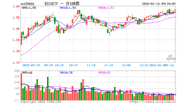 1月16日,创50ETF(159681)开盘涨0.52%,报1.557元。创50ETF(159681)重仓股方面,宁德时代开盘涨1.20%,中际旭创涨1.75%,东方财富涨0.96%,新易盛涨2.53%,阳光电源涨1.44%,胜宏科技涨1.04%,汇川技术涨0.41%,迈瑞医疗涨0.21%,亿纬锂能涨0.53%,同花顺涨1.68%。
