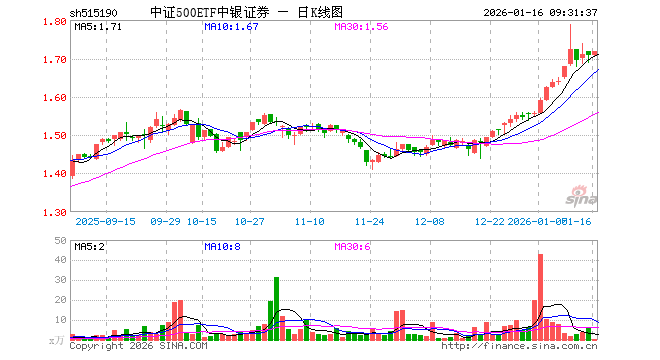 1月16日,中证500ETF中银证券(515190)开盘涨0.00%,报1.708元。中证500ETF中银证券(515190)重仓股方面,胜宏科技开盘涨1.04%,华工科技涨1.01%,芯原股份跌0.25%,先导智能涨1.24%,巨人网络涨0.02%,指南针涨1.53%,卧龙电驱涨0.89%,赤峰黄金跌1.31%,欣旺达涨1.20%,瑞芯微涨1.30%。