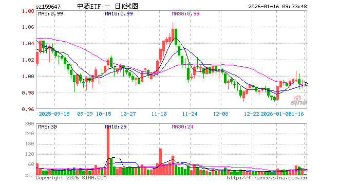 1月16日,中药ETF(159647)开盘涨0.00%,报0.988元。中药ETF(159647)重仓股方面,云南白药开盘涨0.32%,片仔癀涨0.12%,同仁堂涨0.19%,东阿阿胶跌0.39%,吉林敖东涨0.55%,华润三九涨0.24%,白云山涨0.12%,以岭药业涨0.00%,佐力药业跌0.18%,达仁堂跌0.35%。