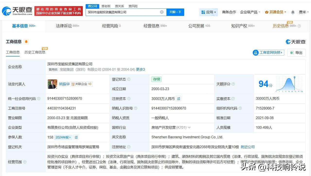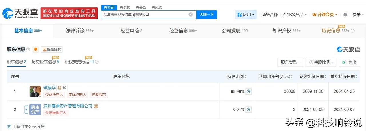 【姚振华等被恢复执行13.4亿】 天眼查天眼风险信息显示,1月15日,深圳市宝能投资集团有限公司、姚振华等新增两则恢复执行信息,执行标的13.4亿余元,执行法院为四川省成都市中级人民法院。 深圳市宝能投资集团有限公司成立于2000年3月,法定代表人为姚振华,注册资本约3亿人民币,经营范围包括投资兴办实业、投资文化旅游产业、经营进出口业务等。股东信息显示,该公司由姚振华、深圳赛康资产管理有限公司共同持股。 据媒体报道,1月14日,宝能集团董事长、观致汽车实控人姚振华发布实名举报视频,称“观致汽车2.7亿元执行案件中存违法行为,常熟工厂核心资产被低估拍卖”。针对这一事件,1月15日下午,常熟市委宣传部相关负责人回应称,姚振华在视频中提到的涉及常熟市人民法院及常熟经开区的指控均不属实。 天眼查信息: