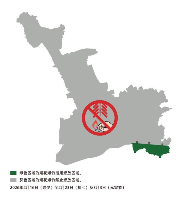 三、农历除夕至正月初七期间(2026年2月16日至2月23日),以及元宵节当天(2026年3月3日),禁止在本区大治河以北区域燃放烟花爆竹(经相关部门审批通过的大型焰火燃放活动除外)。