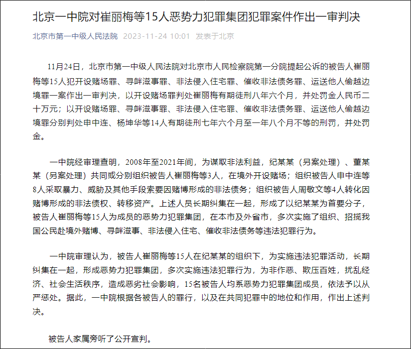 北京市第一中级人民法院对被告人崔丽梅等15人,犯开设赌场罪、寻衅滋事罪、非法侵入住宅罪、催收非法债务罪、运送他人偷越边境罪一案,作出一审判决。