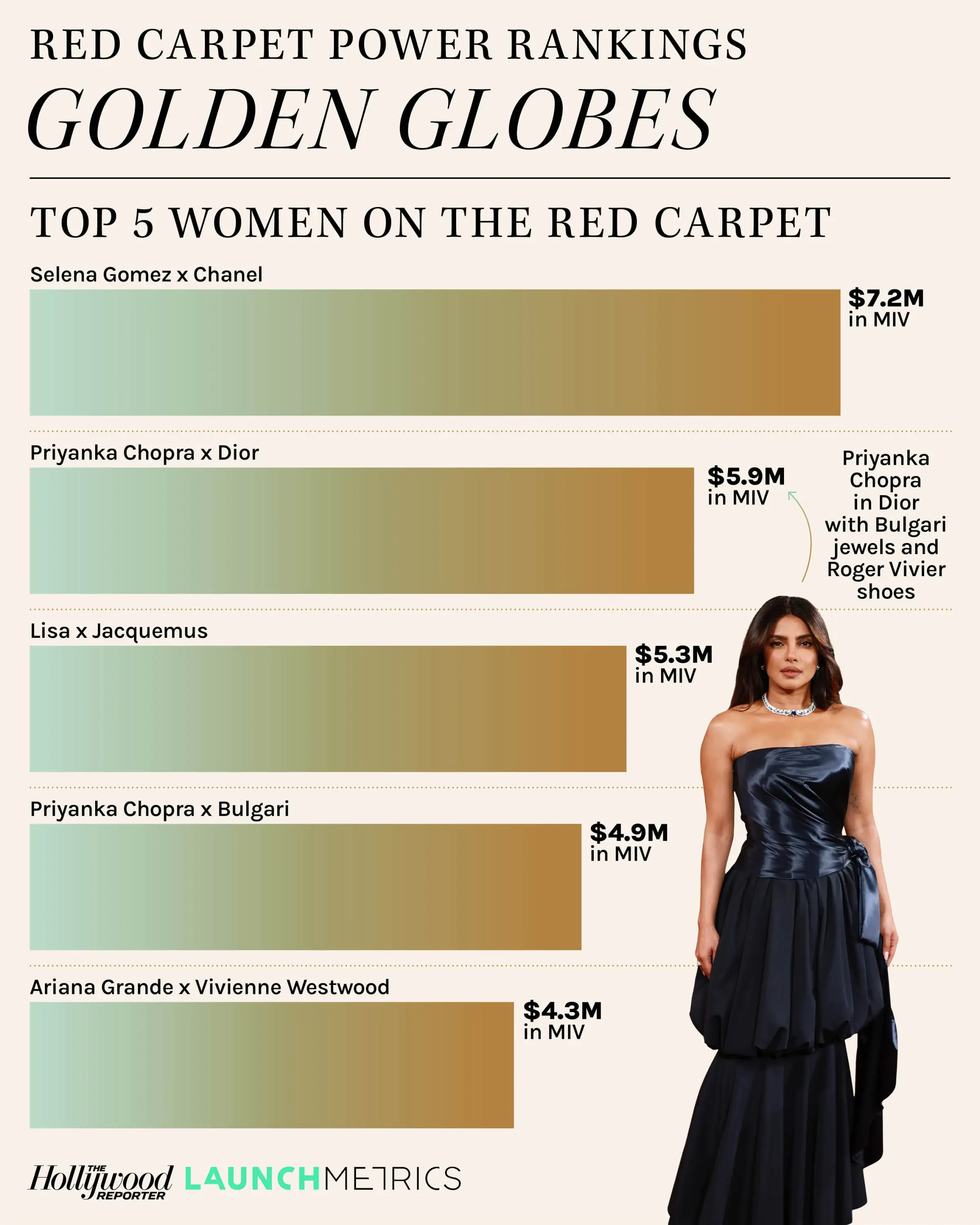 《好莱坞报道者》与Launchmetrics 发布 2026 年金球奖红毯“媒体影响力价值”(MIV)排行榜。它不仅看谁穿得美,更看重明星为品牌带来的实际商业回报和广告效应。从榜单来看,女星红毯的商业统治力依然远超男星。今年男星红毯最大的黑马自然是《巅峰对决》二人组,其中哈德森·威廉姆斯以两项数据霸榜,通过阿玛尼和宝格丽的加持,单人创造了 420 万美元的媒体价值。而他的搭档康纳·斯托瑞紧随其后,也有400万美元的媒体价值。男星红毯 MIV 排行:哈德森·威廉姆斯 x Giorgio Armani:250万美元康纳·斯托瑞 x Saint Laurent:240万美元哈德森·威廉姆斯 xBulgari:170万美元康纳·斯托瑞 x Tiffany & Co:160万美元雅各布·艾洛蒂 x Bottega Veneta:140万美元女星组的量级则完全不同。赛琳娜·戈麦斯以 720 万美元的成绩断层领先,而佩丽冉卡·曹帕拉则表现得极为强势,服装与珠宝双双上榜。LISA 的颁奖礼首秀也展现了强大的价值,位列第三。女星红毯 MIV 排行:赛琳娜·戈麦斯 x Chanel:720万美元佩丽冉卡·曹帕拉x Dior:590万美元LISA x Jacquemus:530万美元佩丽冉卡·曹帕拉 x Bulgari :490万美元艾莉安娜·格兰德x Vivienne Westwood:430万美元