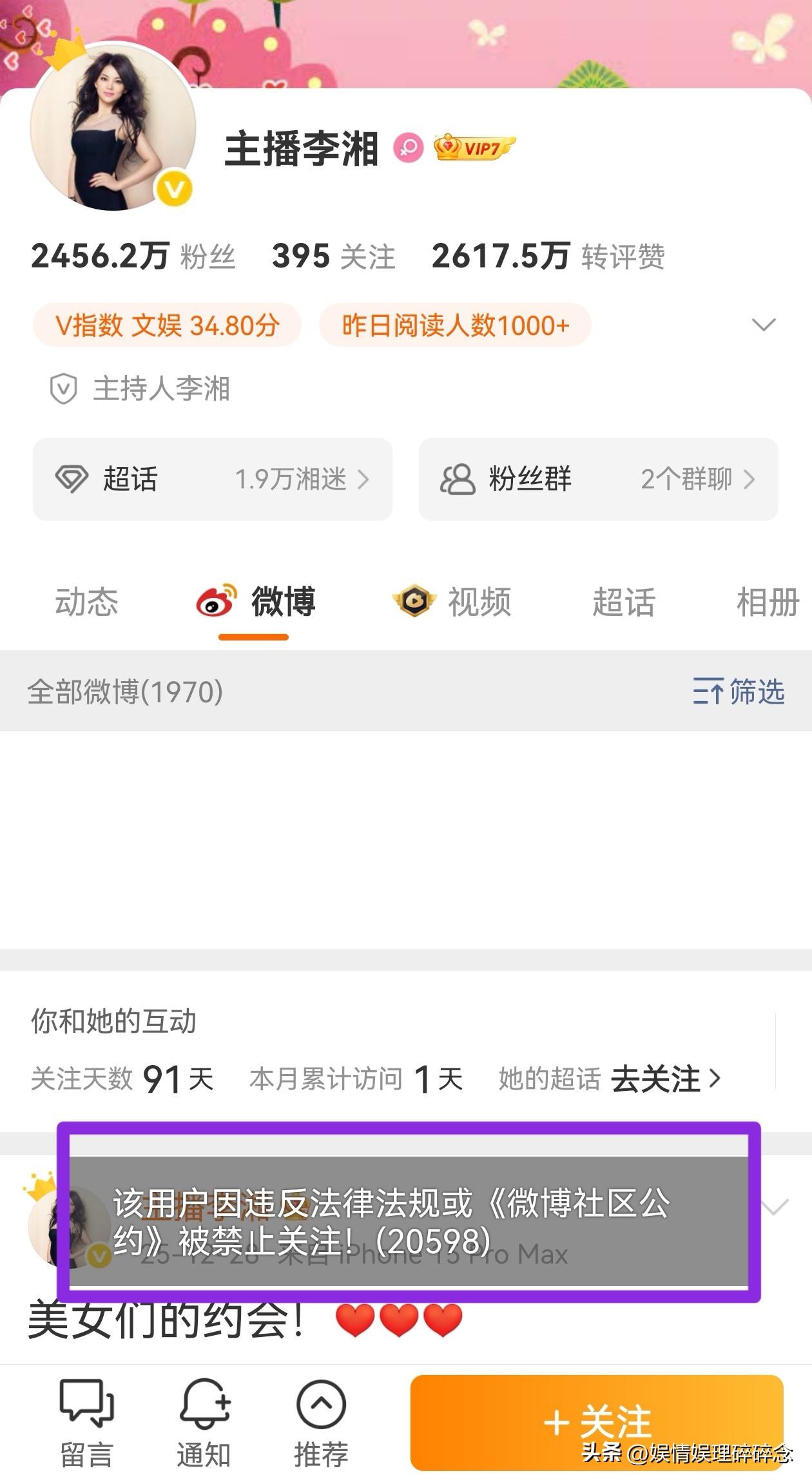 太意外了, 李湘的社交平台都被禁止关注了, 查看了她最近发的动态,发现都是她和女儿的各种动态。 最近的一条视频是王诗龄和张艺兴一起跨年,再往前就是各种聚会了。众所周知,李湘是真富,她也毫不掩饰。从每月万元伙食费、到女儿身上的奢侈品,她的社交动态几乎是“财富可视化”的合集。 只不过,最近闫学晶的事闹得沸沸扬扬,网友都说李湘也是因为“炫富”太过招摇,戳中了大众对明星炫富的敏感神经,才被禁止关注的。 公众人物的社交账号有巨大的影响力,当大家看到的都是金钱堆砌的奢华生活,无疑会加剧加剧普通群体的心理落差,还会误导青少年“财富即一切”,不再脚踏实地的努力,只想一夜暴富。 这次李湘被全平台禁止关注,并未封禁,或许只是一个警告的信号,也或许还有其他更深的原因,这事大家怎么看?
