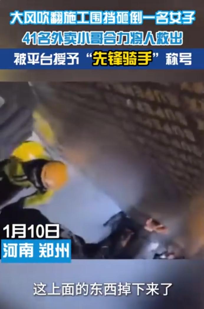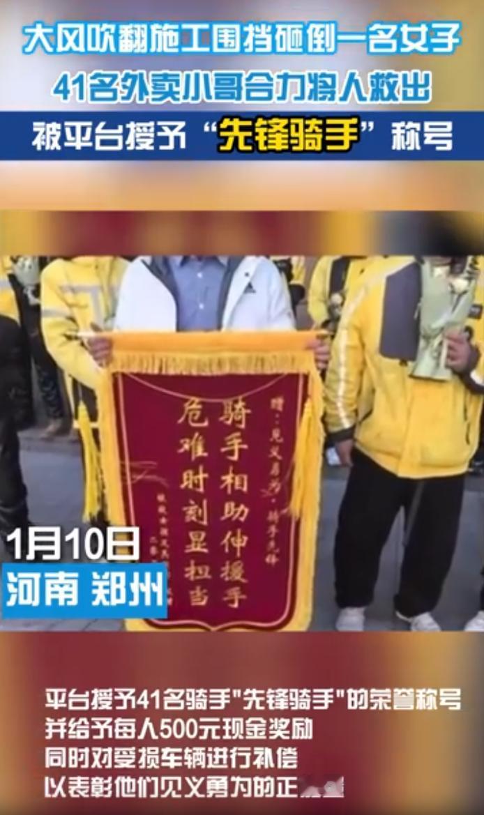 1月10日,河南郑州街头突起大风,路边施工围挡被掀翻,一名路过女子被压在地上。 紧挨着不远处,一群正在开早会的外卖骑手几乎同时冲出人群,四十一个人一并上手,抬起、顶住、稳住,把沉重的围挡撑开,把人从夹缝里救了出来。 我站在路边,看见他们没有多余的交流,却分工自然。 有人蹲下找施力点,有人用肩膀把围挡往上顶,有人扶着防止二次倾倒,还有人已经拨通了急救电话。 女子被转移到安全位置后,他们仍然托着围挡不放,等到救护车赶到,又一起协助送医。 风很冷,他们把人交到医护手里,又悄悄回到岗位,继续各自的订单。 后来我看到美团平台的回应,给四十一名参与救援的骑手授予先锋骑手称号,每人奖励五百元,并对救援中受损的车辆予以补偿。 这样的认可来得及时而踏实,让善举不仅停在暖心视频里,也落在切实的保障上。 城市的清晨常常带着匆忙和寒意,那天我看见的是彼此托举的力量。 他们是穿梭在街头的小哥,也是关键时刻托住生命的支架。 为这份果敢点赞,也为平台的担当点赞。 愿这道被看见的温度继续流动,下一次需要时,仍有人第一时间冲上前。