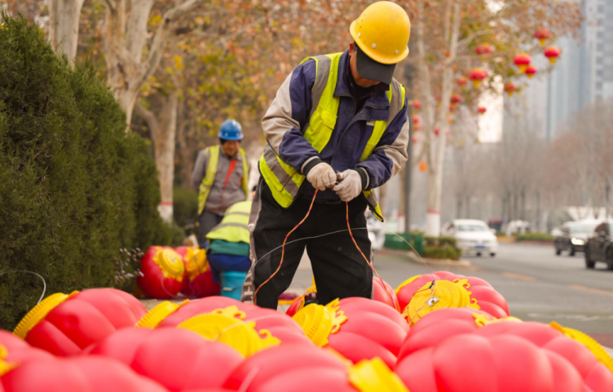 灯笼组装接线、人员安全穿戴、摆放安全措施、启动登高车并开始悬挂……随着春节临近,为营造欢乐祥和、喜庆热烈的节日氛围,金水区城市管理局秉持“节约环保、突出成效、安全美观”的原则,提前谋划、精心部署,对金水路、经七路等主要道路进行灯笼悬挂。工作人员利用高空作业车,互相配合,有条不紊地组装、调试,打造多层次、立体化的亮化效果。安装完成后,高挂的红灯笼将道路装扮得一片火红,浓浓的年味扑面而来。