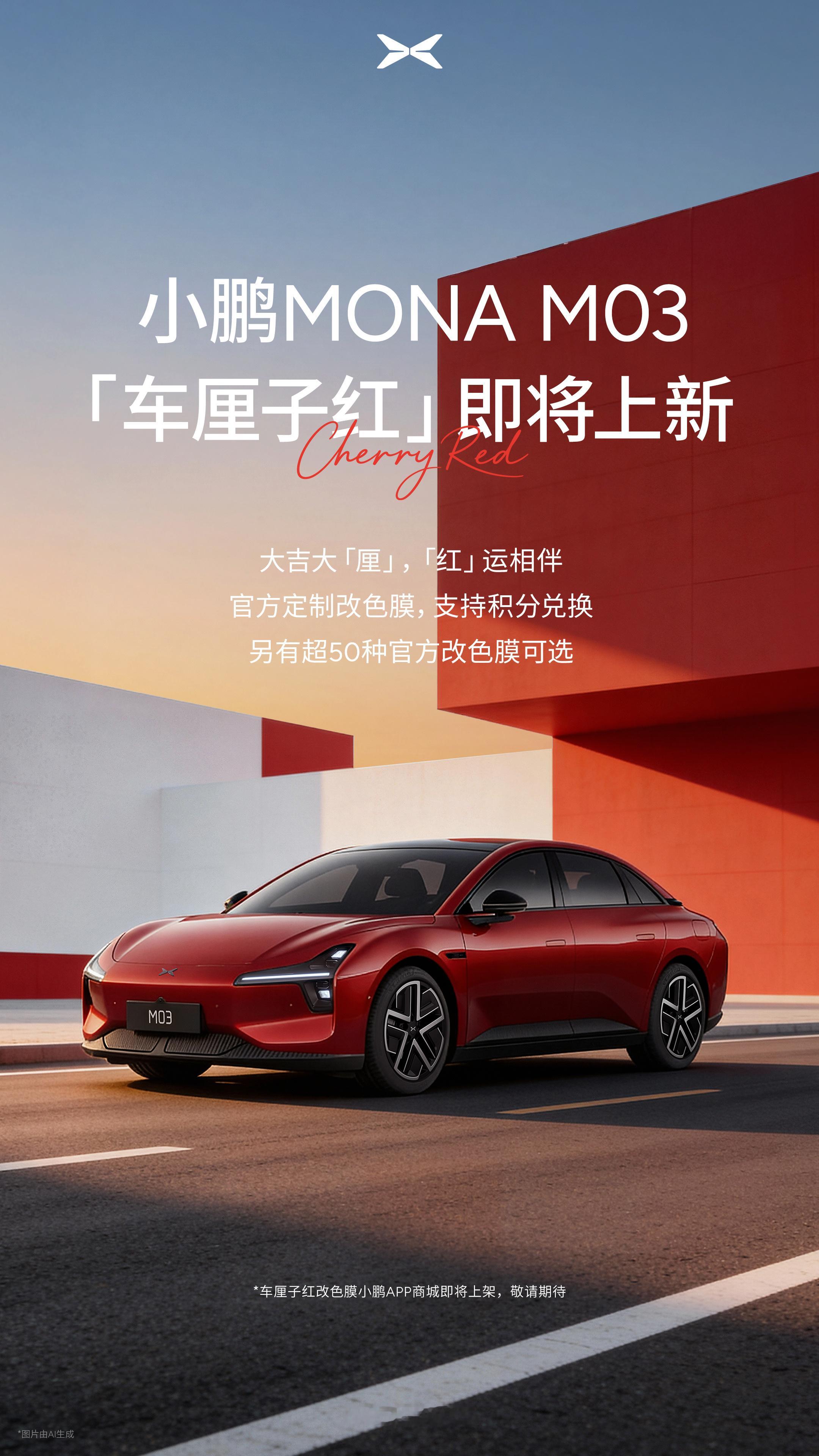小鹏MONA M03新出了一款车厘子红配色,年底了有人能送我一亮红车开嘛~应个景!小鹏MONA官方改色车厘子红即将上线小鹏MONA新年战衣