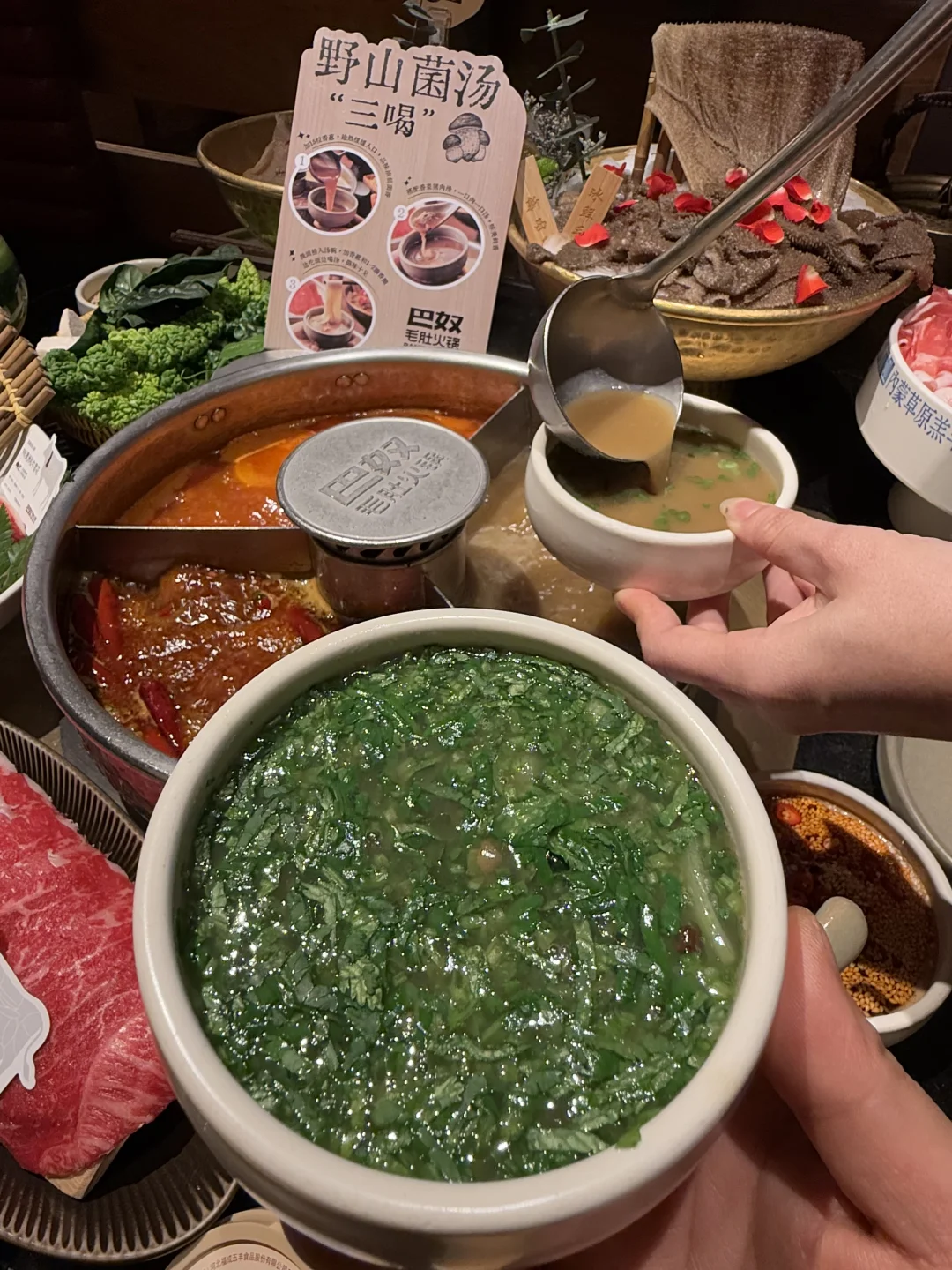 1️⃣用拽面包mini虾滑饺子,在菌汤锅里煮熟,调个红油剁椒麻酱料淋上去,QQ弹弹的虾滑饺子裹满酱汁,一口下去好吃到脖子伸出二里地!! 2️⃣用拽面做一份香菜猪肉滑菌汤面,拽面拉成长条和香菜猪肉滑在菌汤锅里煮好盛出来浇上菌汤,撒上香菜葱花,真的鲜到姥姥家了!! 3️⃣吃韧性新西兰冰鲜毛肚,M6澳洲和牛雪花,内蒙草原羔羊…毛肚涮牛油辣汤蘸蒜泥香油真的绝! 最后说两句他家的奔驰锅底真的每种都好吃!个人心中坠爱野生菌汤,牛油辣,番茄!野生菌汤真的很鲜美,还能菌汤三喝,直接喝汤,搭配香菜猪肉滑,搭配拽面! 还有很喜欢他家的小料台,每种锅底对应的蘸料都调好了,特别适合我这种懒人hhhh 就在赛格7层,大家快去试试!!! 西安赛格西安美食巴奴拽面DIY西安品质火锅首选巴奴西安必打卡火锅巴奴夜宵西安精致生活西安巴奴毛肚火锅赛格店