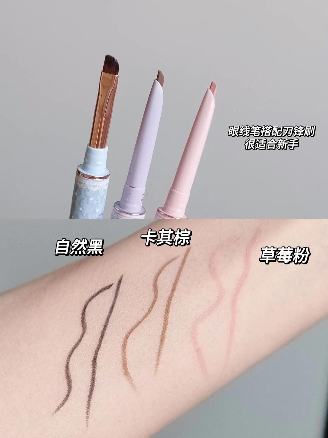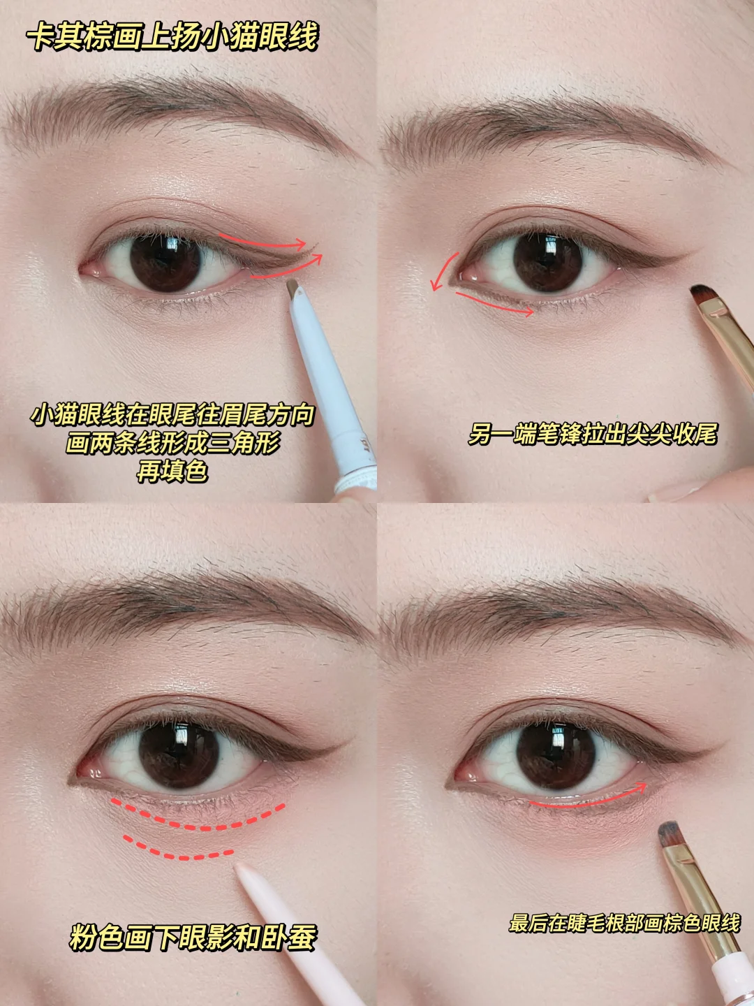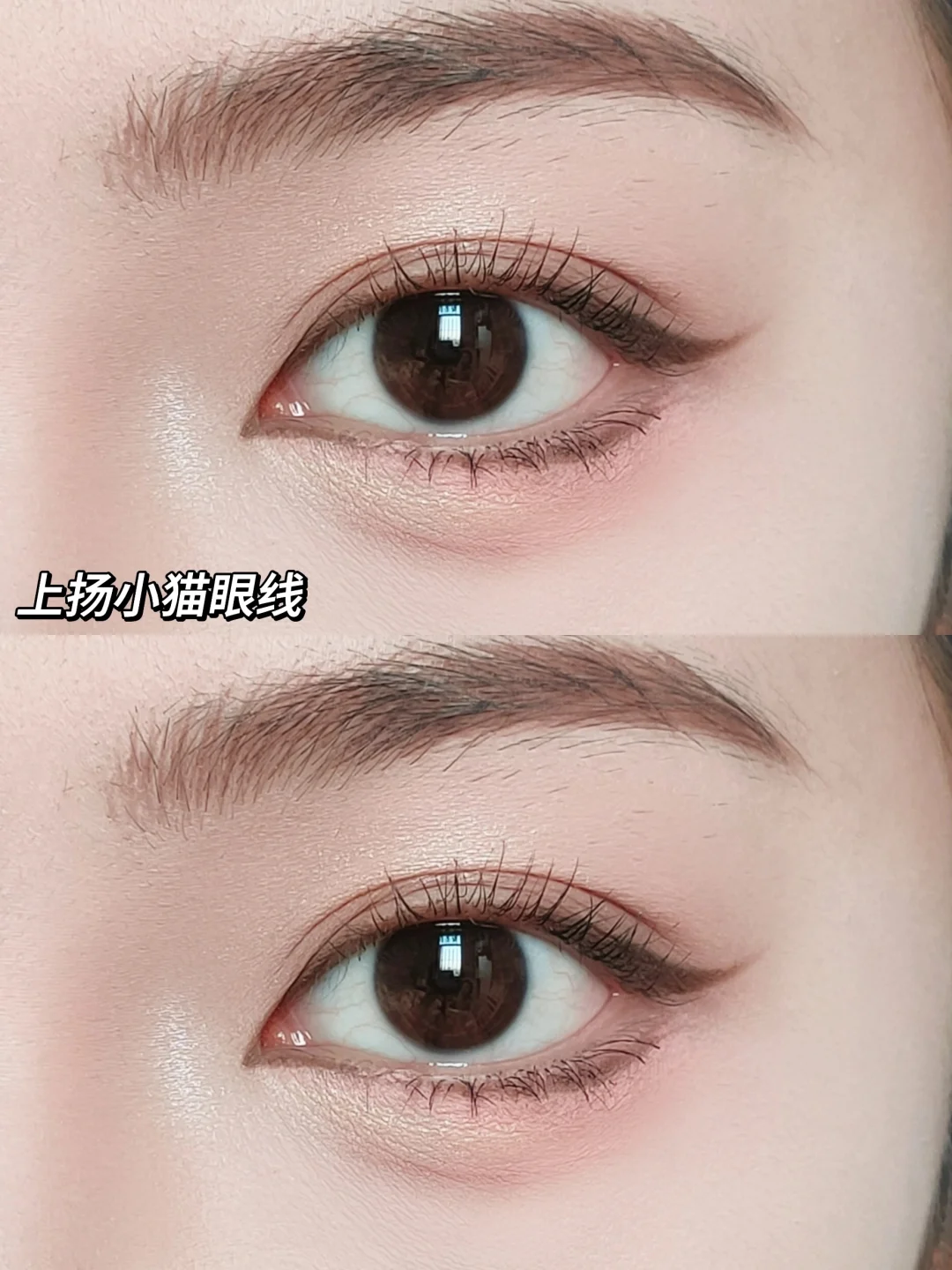 02 卡其棕+03 草莓粉:浅棕搭配草莓粉 画上扬小猫眼线 温柔又不失俏皮
