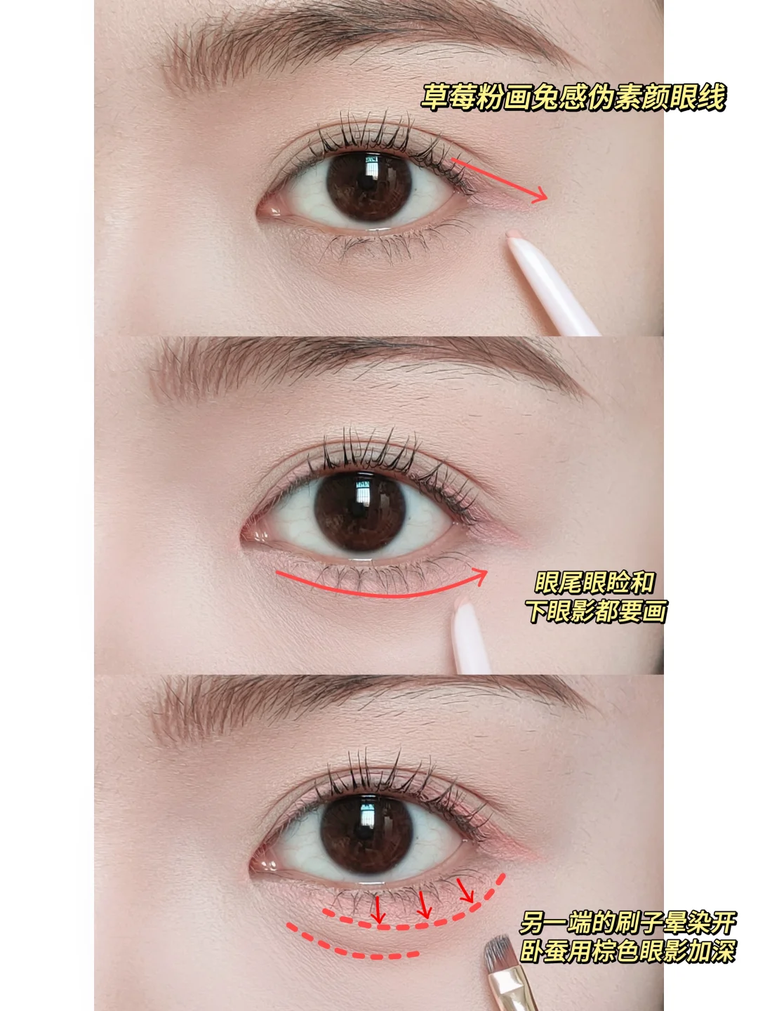 03 草莓粉:粉色眼线有小兔子般的小哭包感 无辜可爱伪素颜眼妆!可以搭配甜美系妆容~