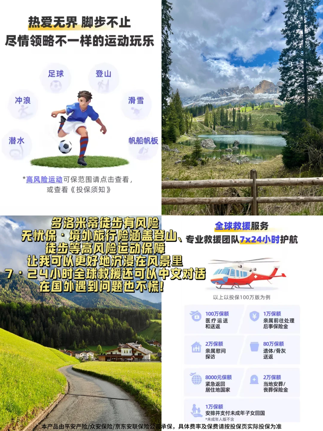 高风险运动保障:无忧保贴心的一点就是,滑雪、冲浪、潜水等高风险运动运动都能保,也就是买了这款旅行险,我才去多洛米蒂登山徒步,全程被保真的很安心!就算真的遇上大小意外,也可以电话寻求帮助,7*24小时全球紧急救援能中文沟通,太方便了!