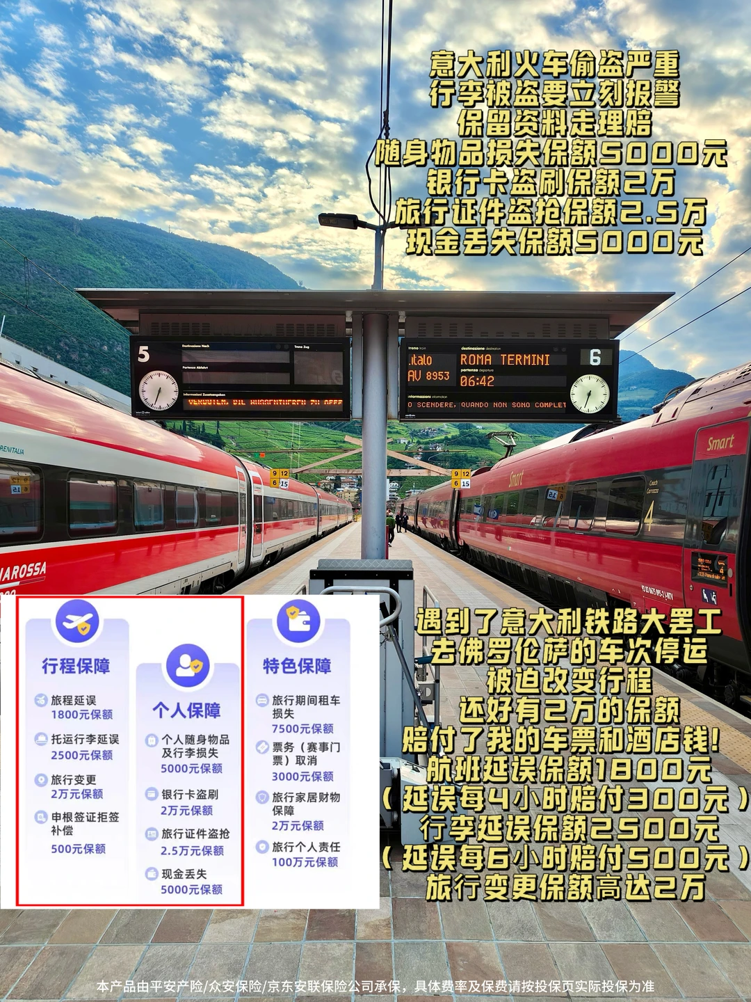 突然而来的罢工、莫名被砸的车窗、地铁里的三只手……真是让人防不胜防😭熟悉我的老粉都知道,我出去玩都要备上无忧保·境外旅行险,这次意大利行,也终于亲身明白了境外险的重要😭