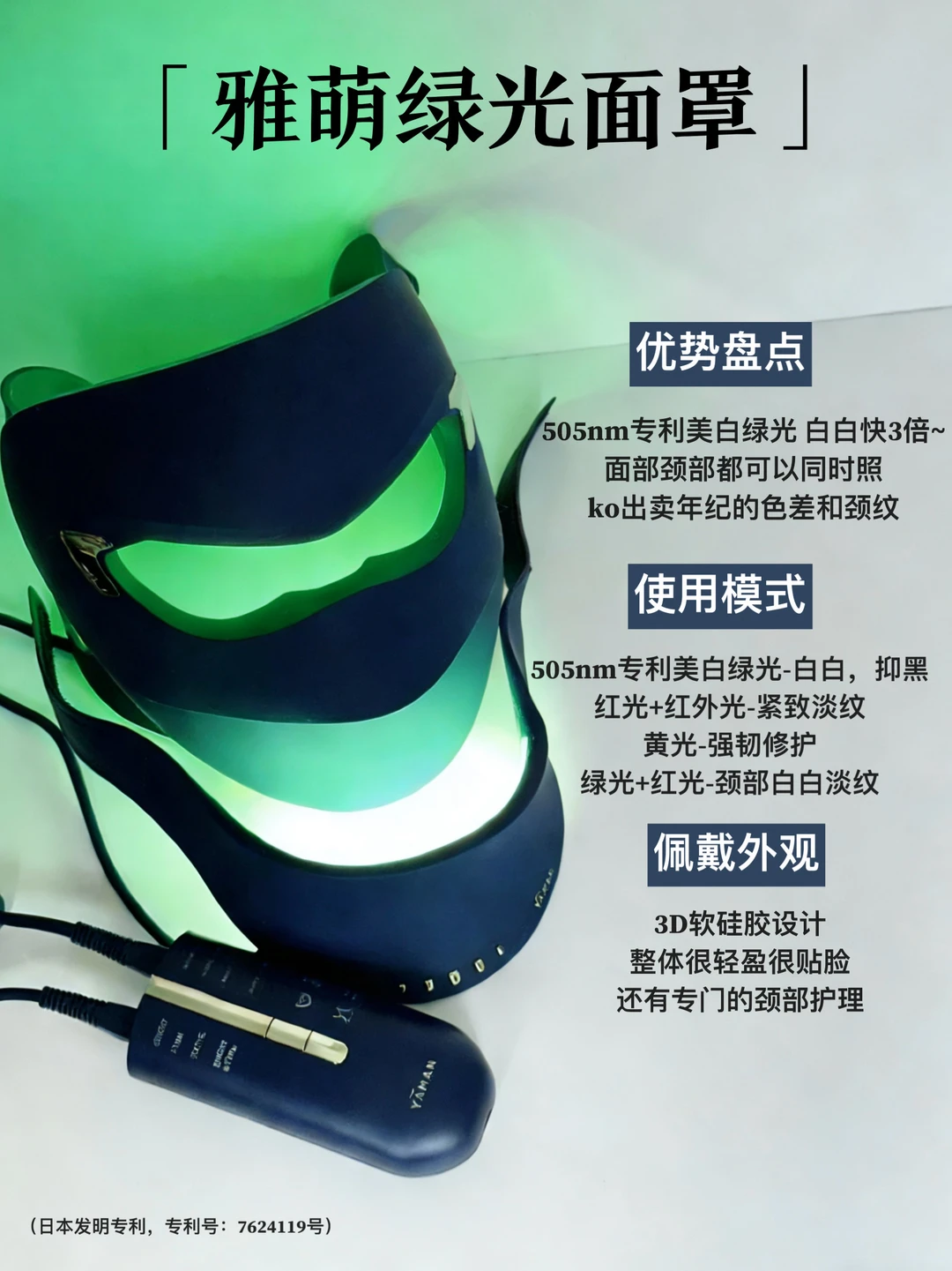 其核心技术就是就是505nm专利美白绿光,精准狙击黑色素,让晒斑和暗沉慢慢“隐形”(日本发明专利,专利号:7624119号)