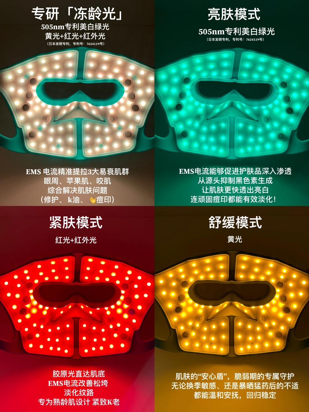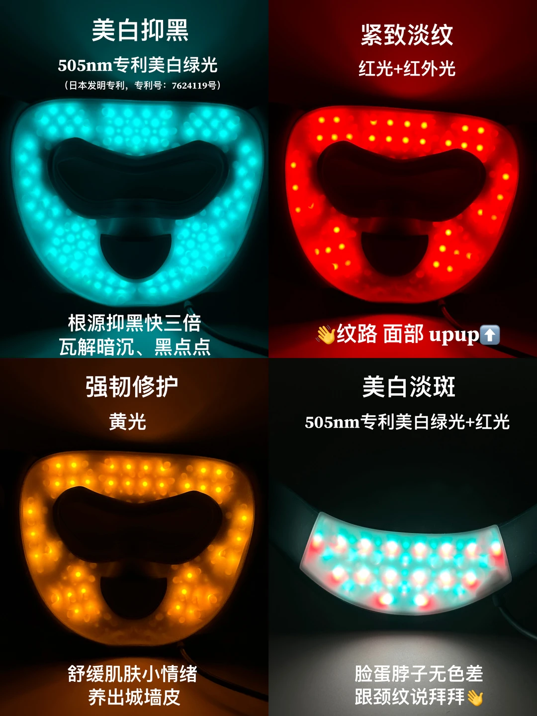 ✅更新LED照光模式,共四种模式:除了基础黄光和胶原光,还有505nm专利美白绿光、专研冻龄光全效护理!