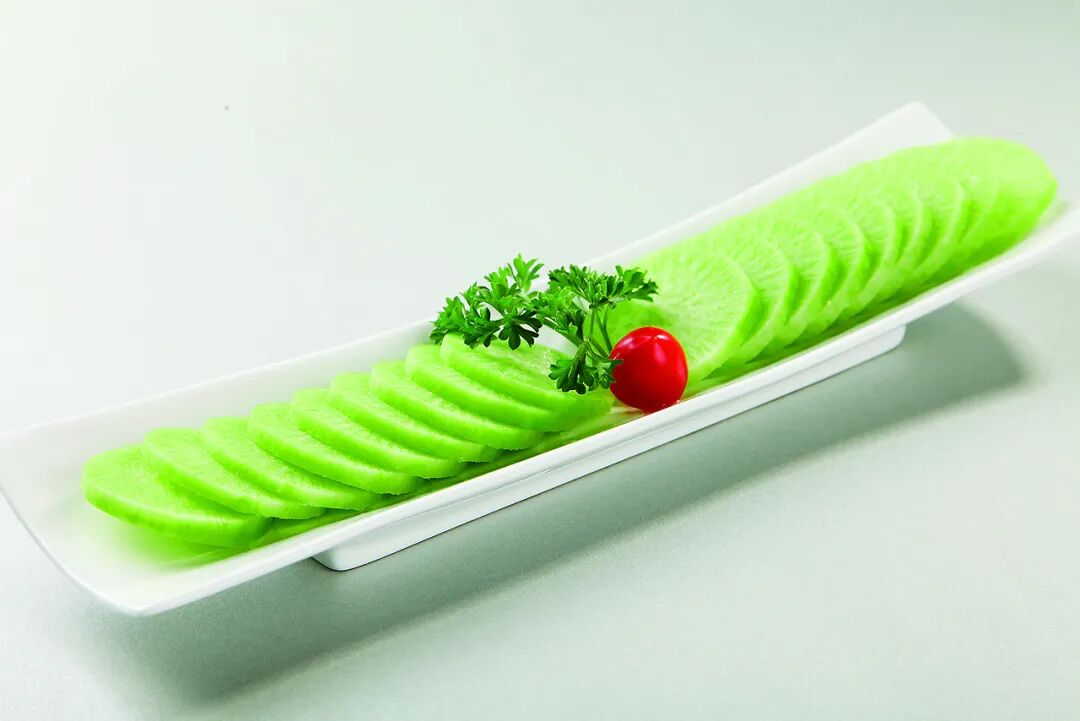 绿皮红肉的心里美、满堂红,以其翠绿的外皮和鲜红脆嫩的果肉而得名,北京经典凉菜“拌心里美”就是用它制作的——切成细丝后用糖醋调味,酸甜爽口,色彩诱人。