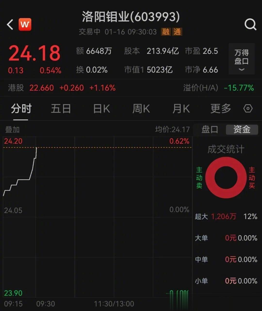 1月16日,洛阳钼业股价开盘即拉升,总市值突破5000亿元大关。