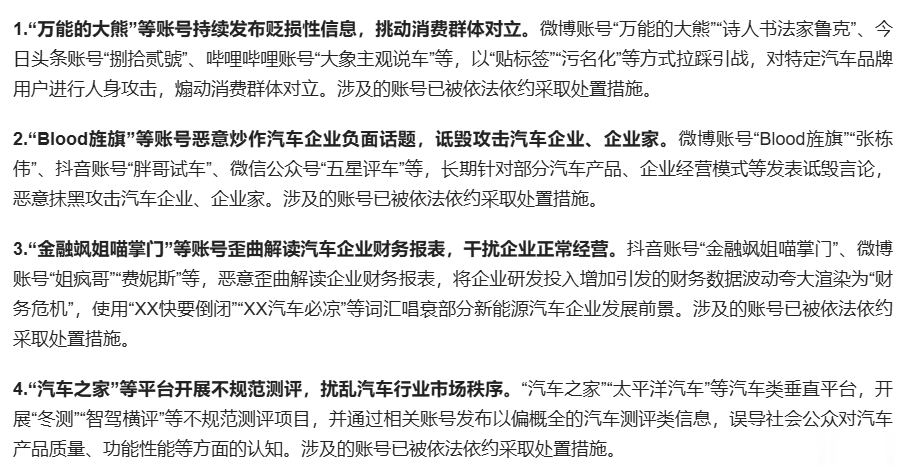 近期,国家网信办会同工业和信息化部等部门聚焦挑动群体对立、炒作负面话题、开展不规范测评等突出问题,持续深入开展汽车行业网络乱象专项整治,依法依约处置一批违法违规账号。现将部分典型案例通报如下: