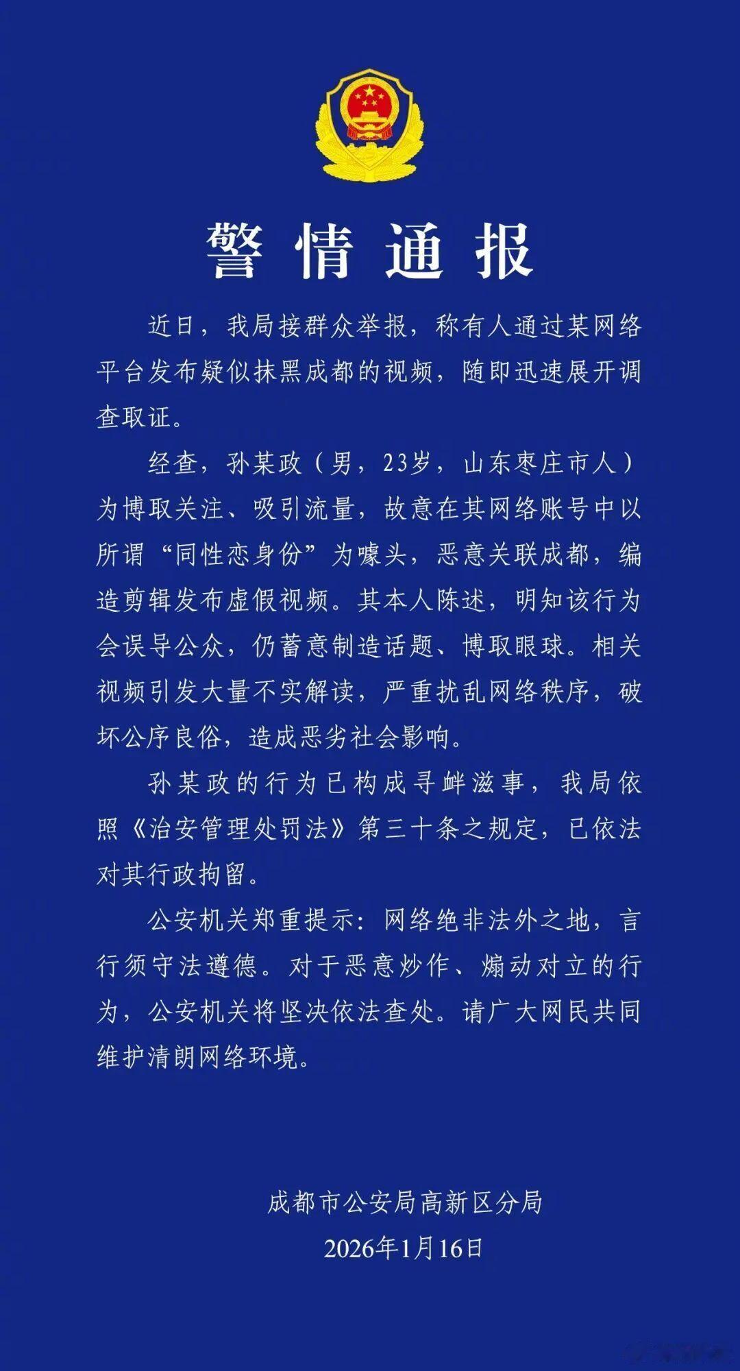 1月16日,成都警方通报:孙某政(男,23岁,山东枣庄市人),恶意关联成都,剪辑发布虚假视频,被行政拘留。