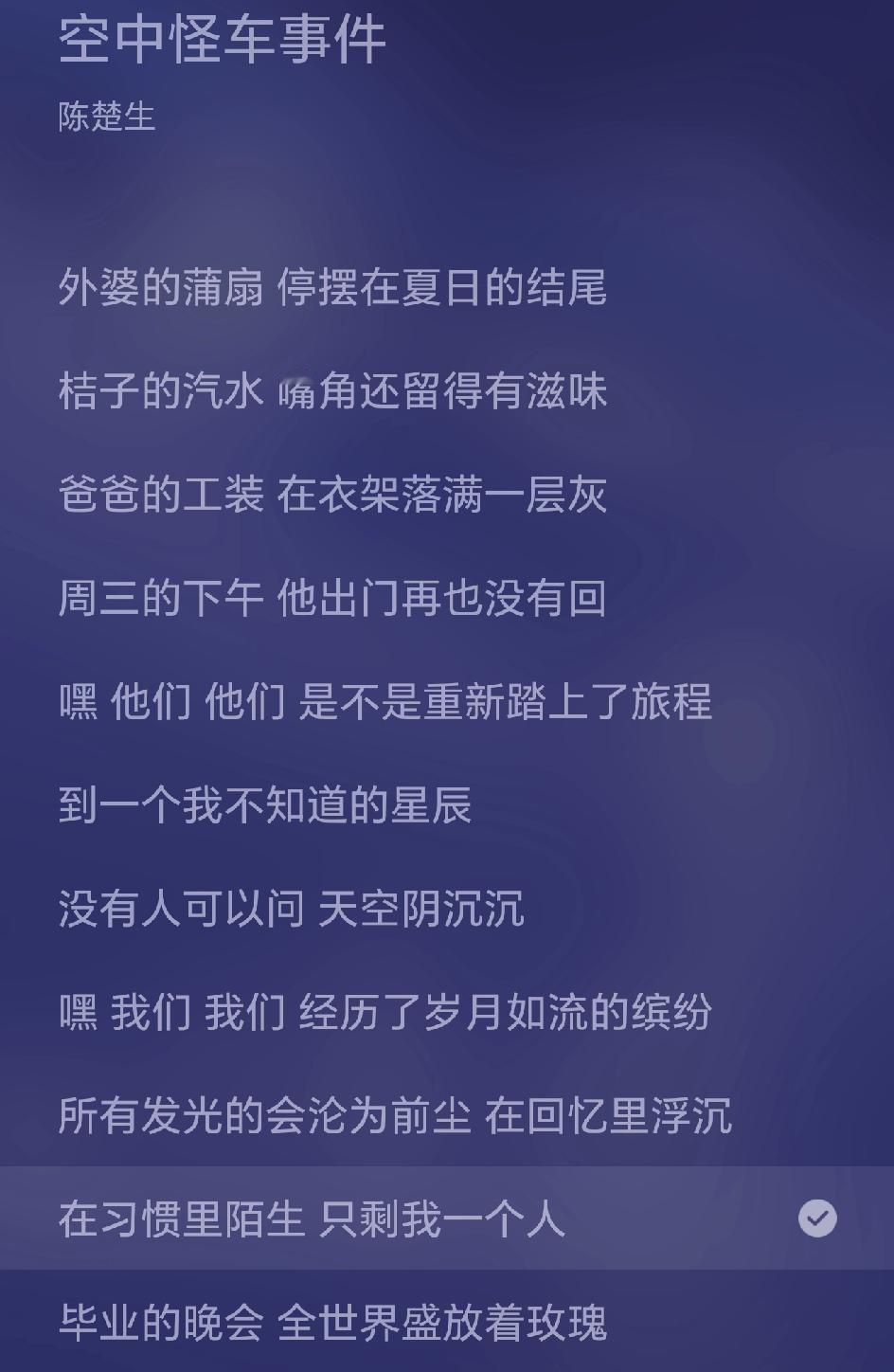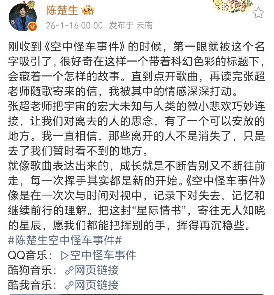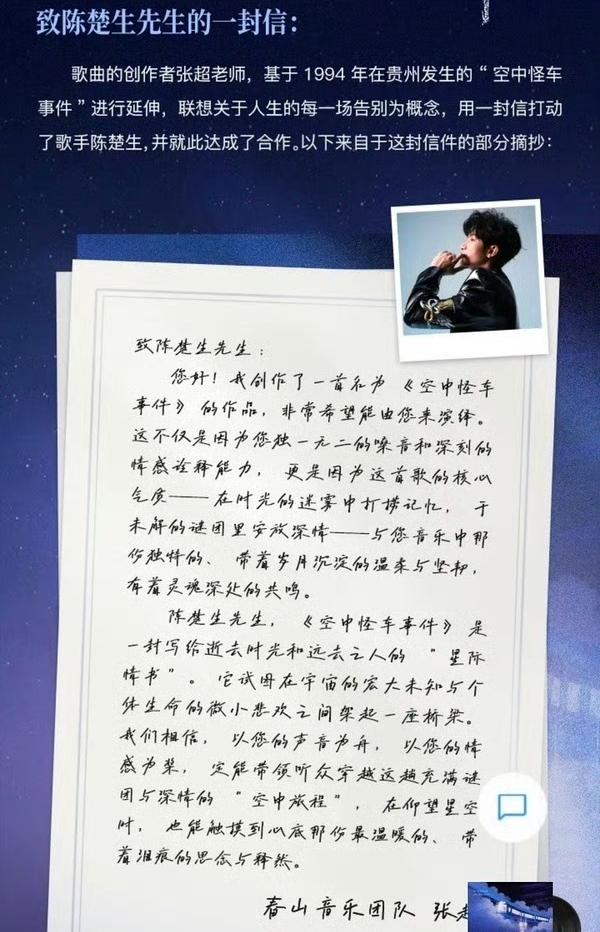 陈楚生发行新歌《空中怪车事件》,好奇怪的名字! 去搜了一下事件背景,太魔幻了,一场谁也解释不了的怪事件,30年过去了,科技越来越发达,这件事却成了永远的未解之谜! 了解了事件的经过,不禁感叹,也许会在某个突然之间,面对无法扭转的力量之下,我们终将会失去所有~ 想起生命里那些已经告别的身影, 他们是不是重新踏上了旅程, 到一个我不知道的星辰, 听到这里不禁潸然落泪, 那些失去的亲人,朋友,一定会在某一个我不知道的星辰里,依然在成长,在前行! 那些离开的人不是消失了,只是去了我们暂时看不到的地方[流泪]! 创作者特意给陈楚生写了一封信,致陈楚生先生,突然感觉好正式,这是高山流水的交流,只为心中那一抹沉重!陈楚生的回应很感人,把这封星际情书,寄往无人知晓的星辰! 这首歌没做宣传,却在上线14小时冲顶QQ潮流榜首,春山乐队选对了人,好眼光!陈楚生