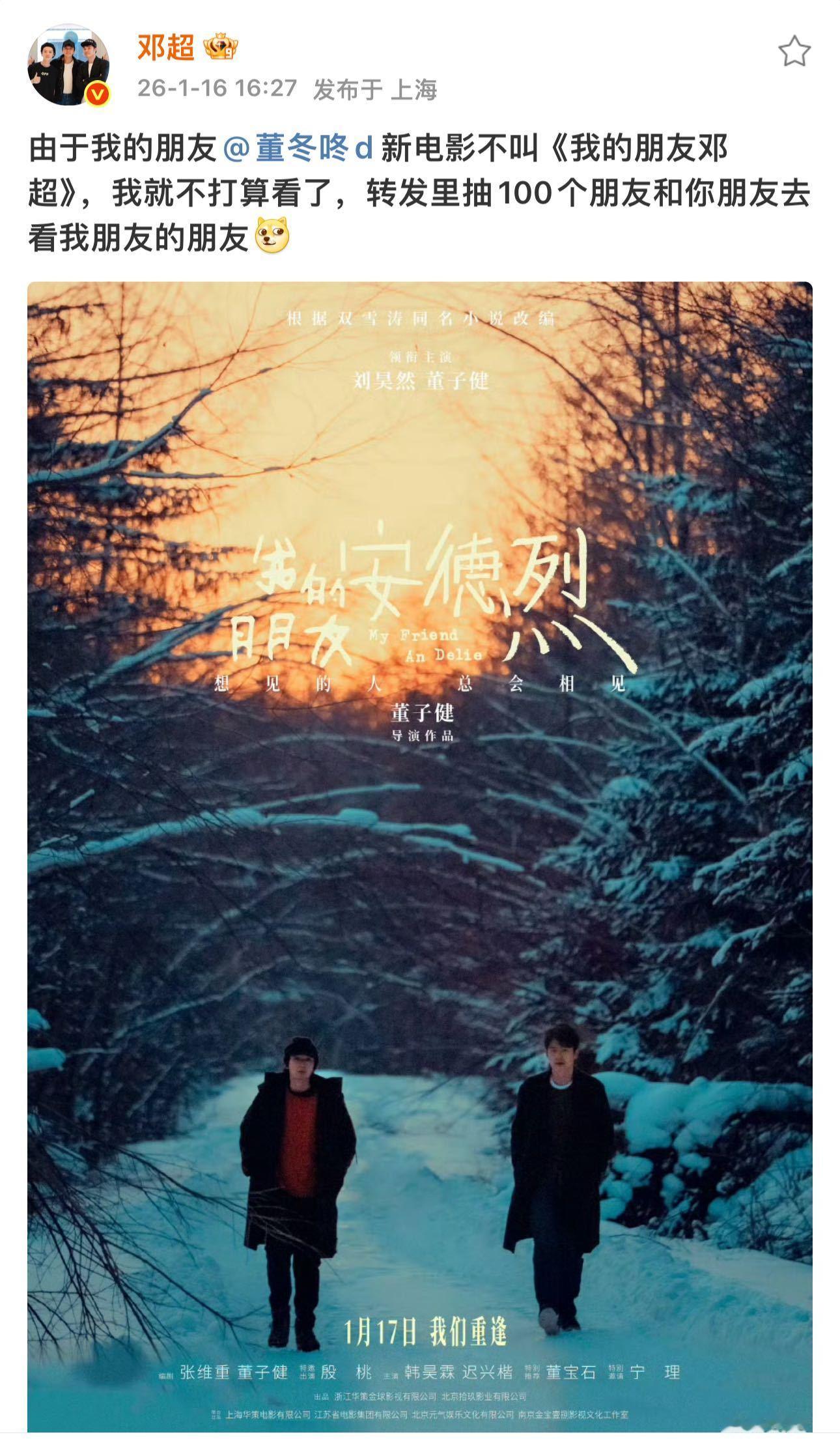 邓超不看董子健新电影的原因 邓超包场支持董子健导演的新电影《我的朋友安德烈》,两人发博和回复的搞笑程度不相上下,成功吸引到我了,1月17日去看《我的朋友安德烈》