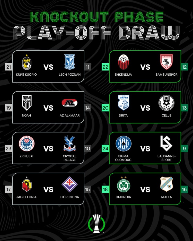 直播吧1月16日讯欧足联官方公布了欧协联淘汰赛附加赛对阵情况,乔治罗尼亚和佛罗伦萨交手,水晶宫的对手则是日林斯基。
