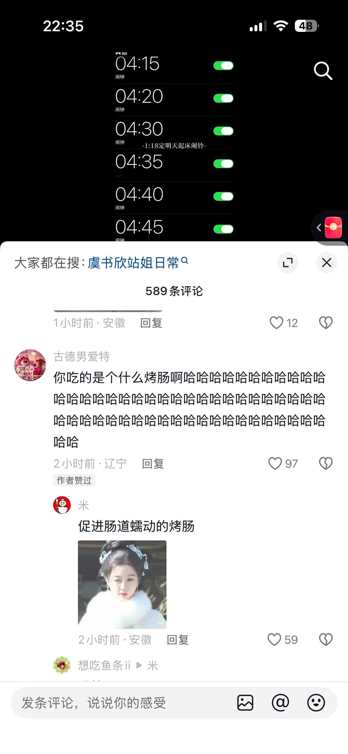 我要被这个虞书欣站姐笑死了饿了买了一根烤肠吃了拉肚子评论区:促进肠道蠕动的烤肠哈哈哈哈哈哈哈哈哈哈哈哈哈