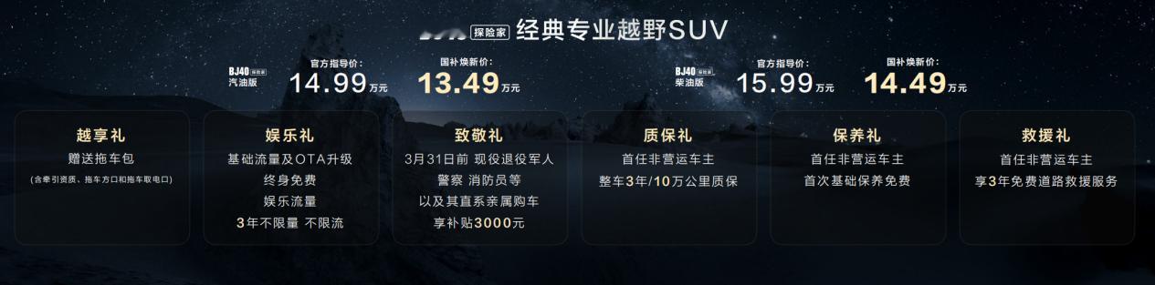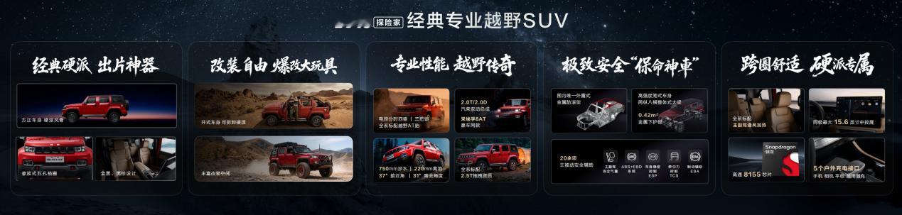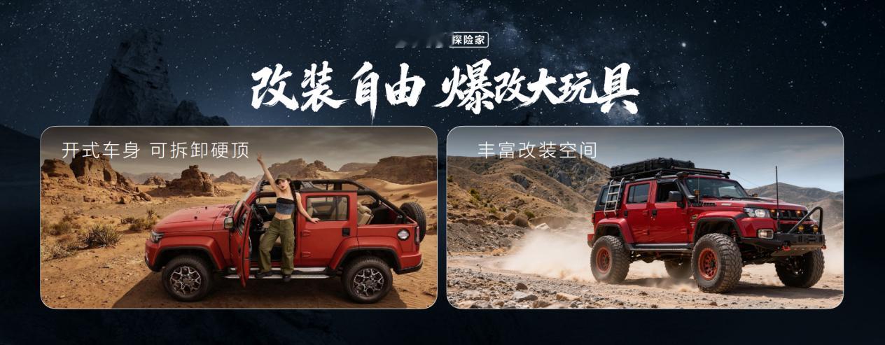 专业越野就选BJ40探险家 北京越野日前发布BJ40探险家及北京81 2.0共创版。BJ40探险家已上市,官方指导价14.99—15.99万元,提供拖车包、免费流量、特定群体补贴等多重礼遇。BJ40探险家在经典设计基础上进行焕新,保留五孔格栅与方正造型,并新增“黑化”套件。车辆配备快拆硬顶,支持敞篷模式,搭载电控分时四驱、三把锁及全地形AT胎,提供2.0T汽油与柴油动力,匹配8AT变速箱。安全方面采用外露式防滚架、高强度车身及锰钢护板。发布会现场,演员晋松演示了车顶拆卸过程。BJ40探险家同时被北京汽车博物馆收藏,此前BJ40增程与BJ80阅兵车已分别入藏国家博物馆和中国共产党历史展览馆,北京越野成为首个被“三馆连藏”的汽车品牌。北京81 2.0共创版基于用户共创模式推出,在造型细节上进行了多项优化。数据显示,BJ40系列累计销量已突破30万辆。爆改大玩具BJ40探险家