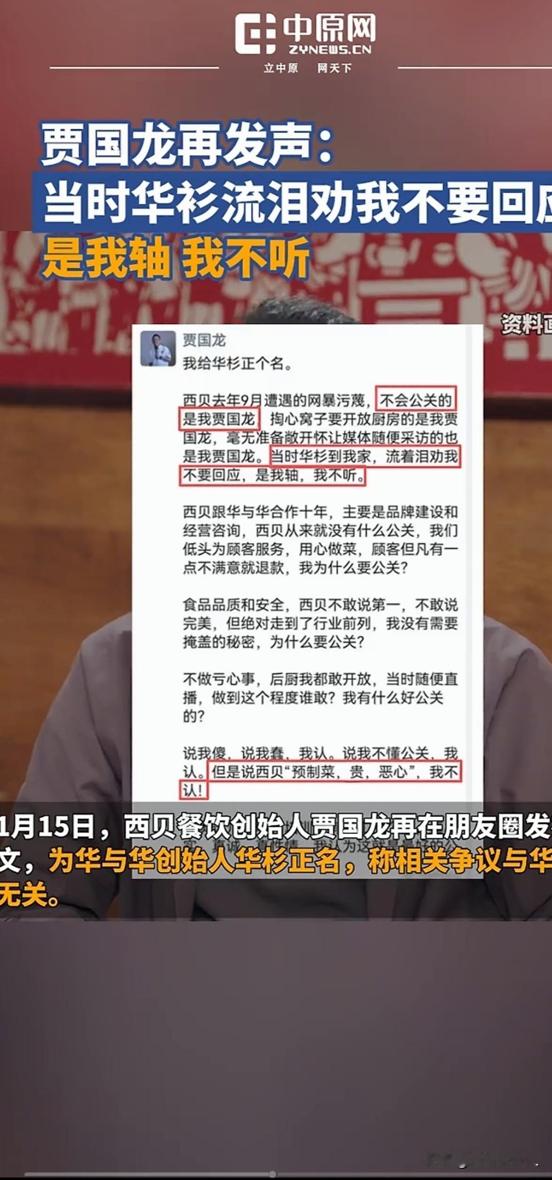 横眉冷对千夫指, 贾氏犹自辩清白 腊月寒风里,贾国龙又立上了舆论的刑场。一百二十五天,他数着日子,将“污蔑”刻进朋友圈的檄文,仿佛鲁迅笔下的祥林嫂,反复念叨着阿毛的悲剧,却不知看客早已散场。 店里关了上百家,亏了五个亿,几千员工等着吃饭——这些您心里都清楚。可您偏要揪着“预制菜”三个字较劲,在朋友圈里一遍遍喊冤,倒像受了天大的委屈。 您说全天下都在污蔑您,要讨个说法。可顾客只在乎端上桌的菜值不值那个价,员工只盼着每月工资能按时发。您对着一地鸡毛谈“骨气”,对着亏损报告讲“正义”,这道理,说给谁听呢? 生意场不是公堂,没有青天大老爷判对错。您越说“宁为玉碎”,看客越觉得您是“和瓦片较劲”。争一口气,输掉全局,员工和家人的饭碗,难道也要为这口气陪葬么? 退一步不是认输,是看清路。企业活着,才有以后的话可以说。
