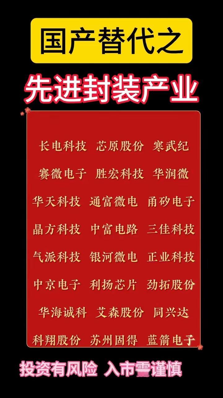 国产替代之先进封装产业。长电科技、芯原股份、寒武纪、赛微电子、胜宏科技、华润微、华天科技、通富微电、甬砂电子、晶方科技、中富电路、三佳科技、气派科技、银河微电、正业科技、中京电子、利扬芯片、劲拓股份、华海诚科、艾森股份、同兴达、科翔股份、苏州固得蓝箭电子。