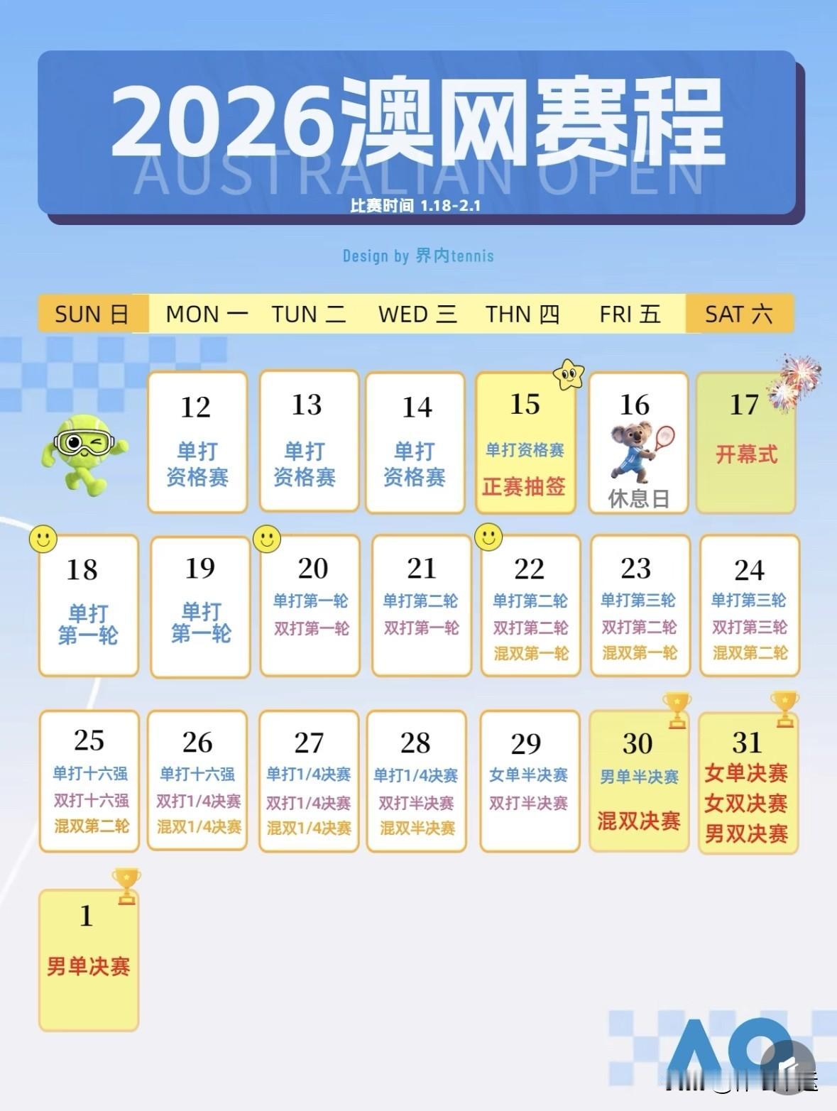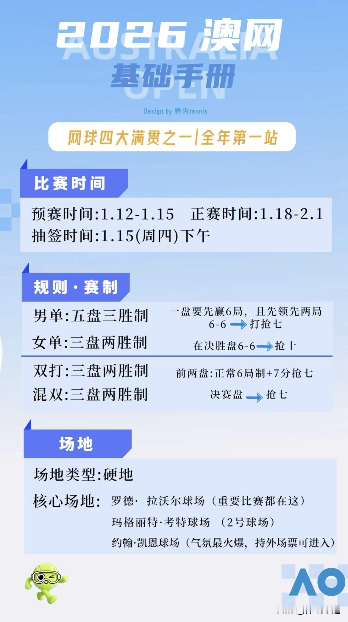 年度第一个网球大满贯赛事如约来到🔥🔥 2026澳网正赛1月18日就要开启啦