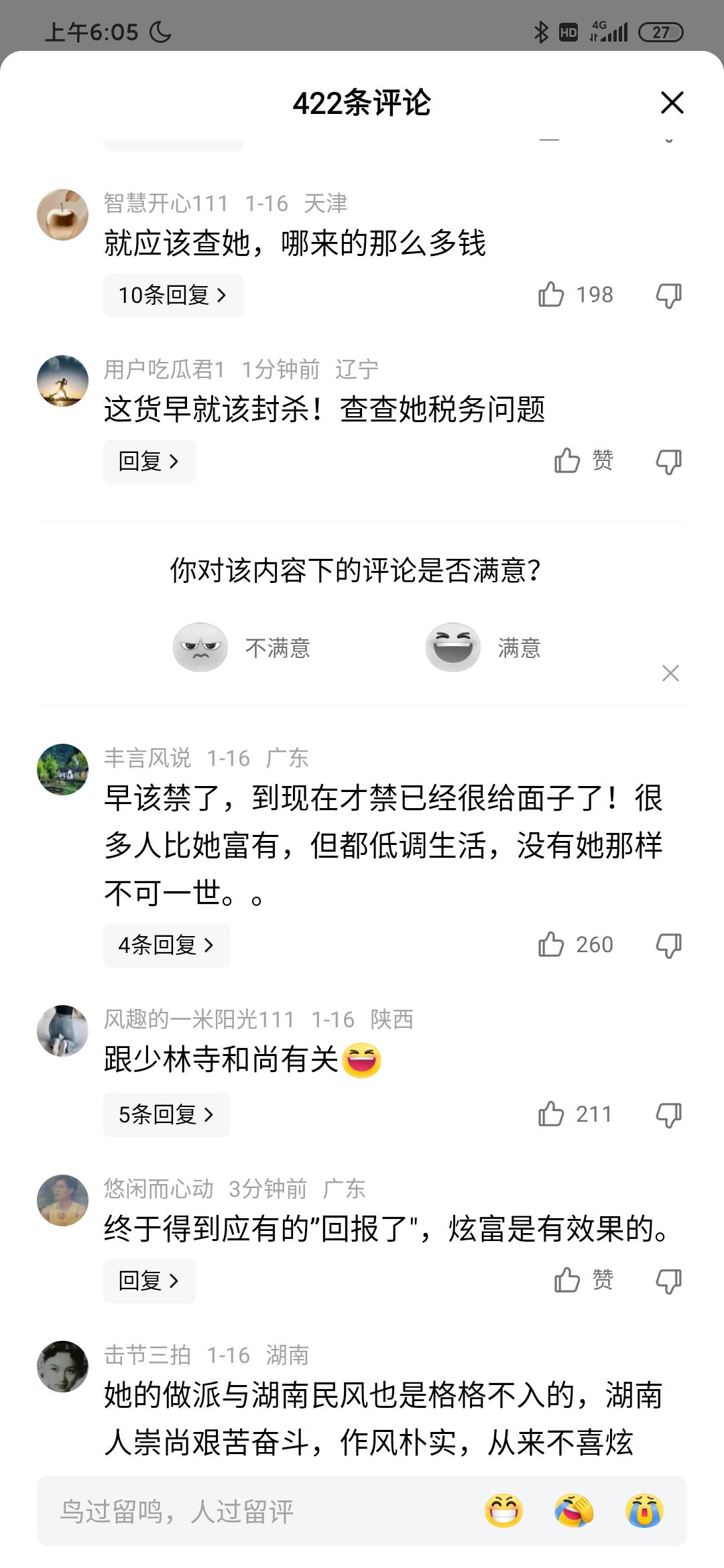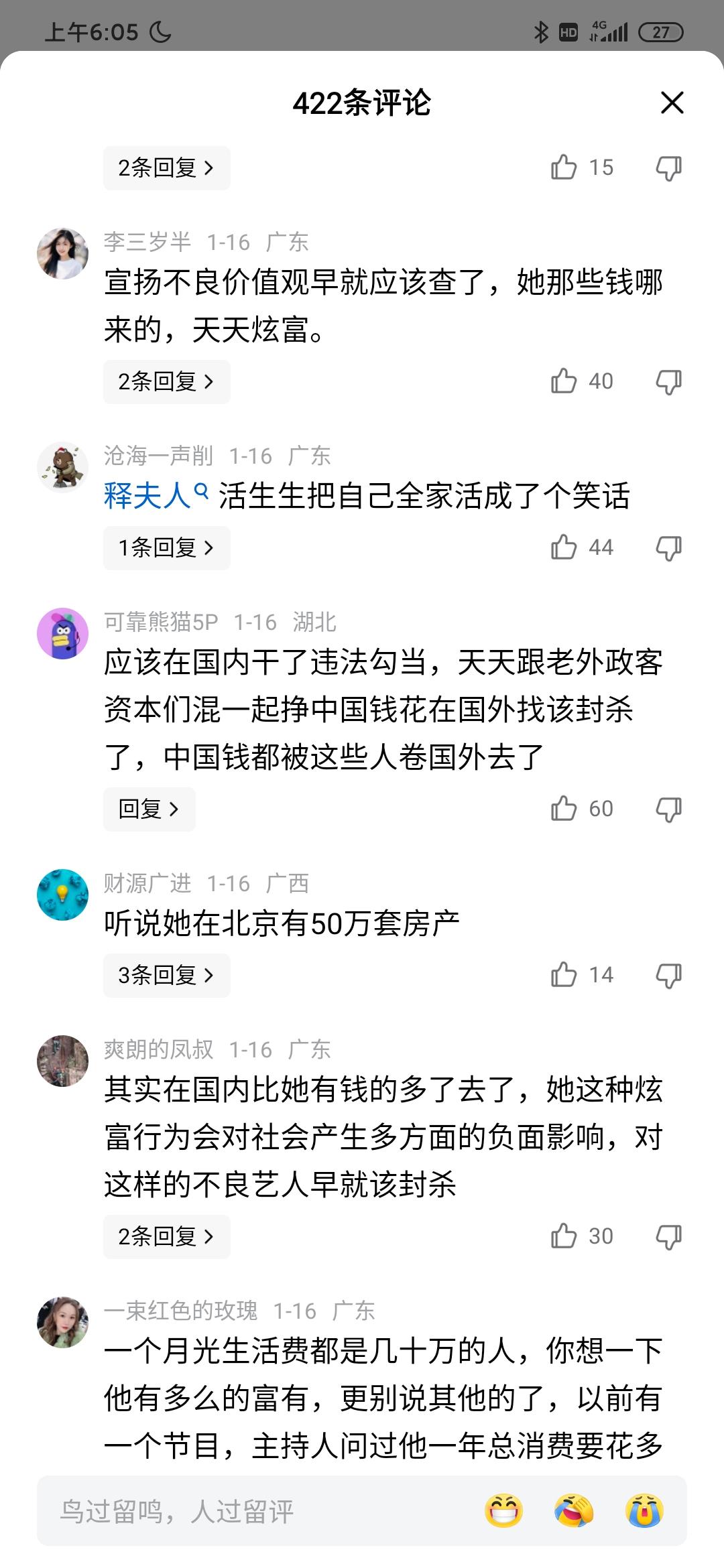 李湘终于把自己炫塌房了,抖音,小红书等各普通都被禁止关注! 李湘年纪轻轻就退休,但是奢侈品,奢靡生活却没有烧,出门多少司机接送,接触的都是各种有头有脸的人物。 网友们也对她的消费和收入持有怀疑态度。有的说消费和收入能划等号吗?还有的说天天除了炫富,带给观众扭曲关,早该封号了! 确实一直李湘都是负面平平,她也不管网友的建议,永远是我是女王,想咋样就咋样。但是你别忘了水能载舟亦能覆舟。老百姓是你的衣食父母,能给你上女王也能让你不是!