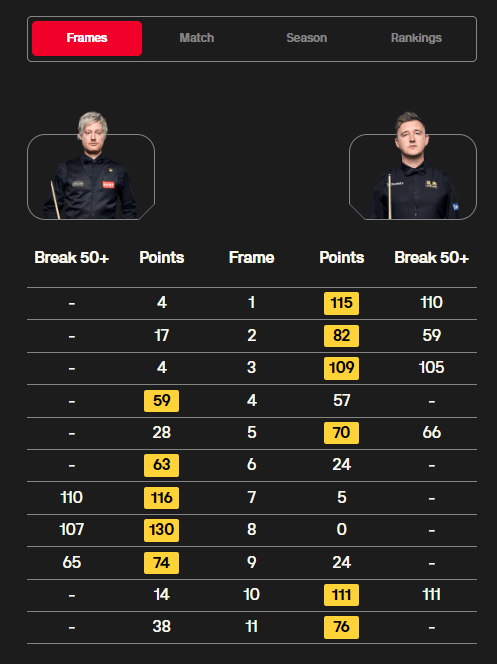 全场比赛,威尔逊打出三杆破百(110、105、111)和两杆50+(59、66),罗伯逊打出两杆破百(110、107)和一杆50+(65)。