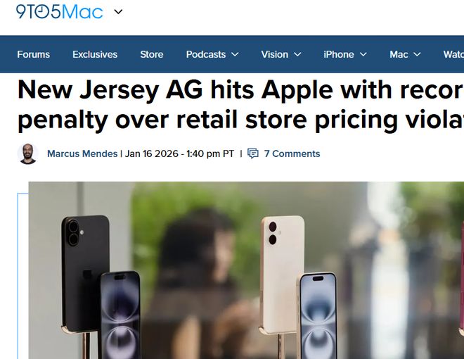 [环球网科技综合报道]1月17日消息,据外媒9to5mac报道,苹果公司与美国新泽西州消费者保护部门达成和解,同意支付15万美元民事罚款,并全面调整门店定价及退款政策公示方式。此次和解源于对该州11家苹果门店的复查,查实其存在反复违反定价及退款政策的行为,这也是该州依据《商品定价法》达成的史上最大金额和解案。