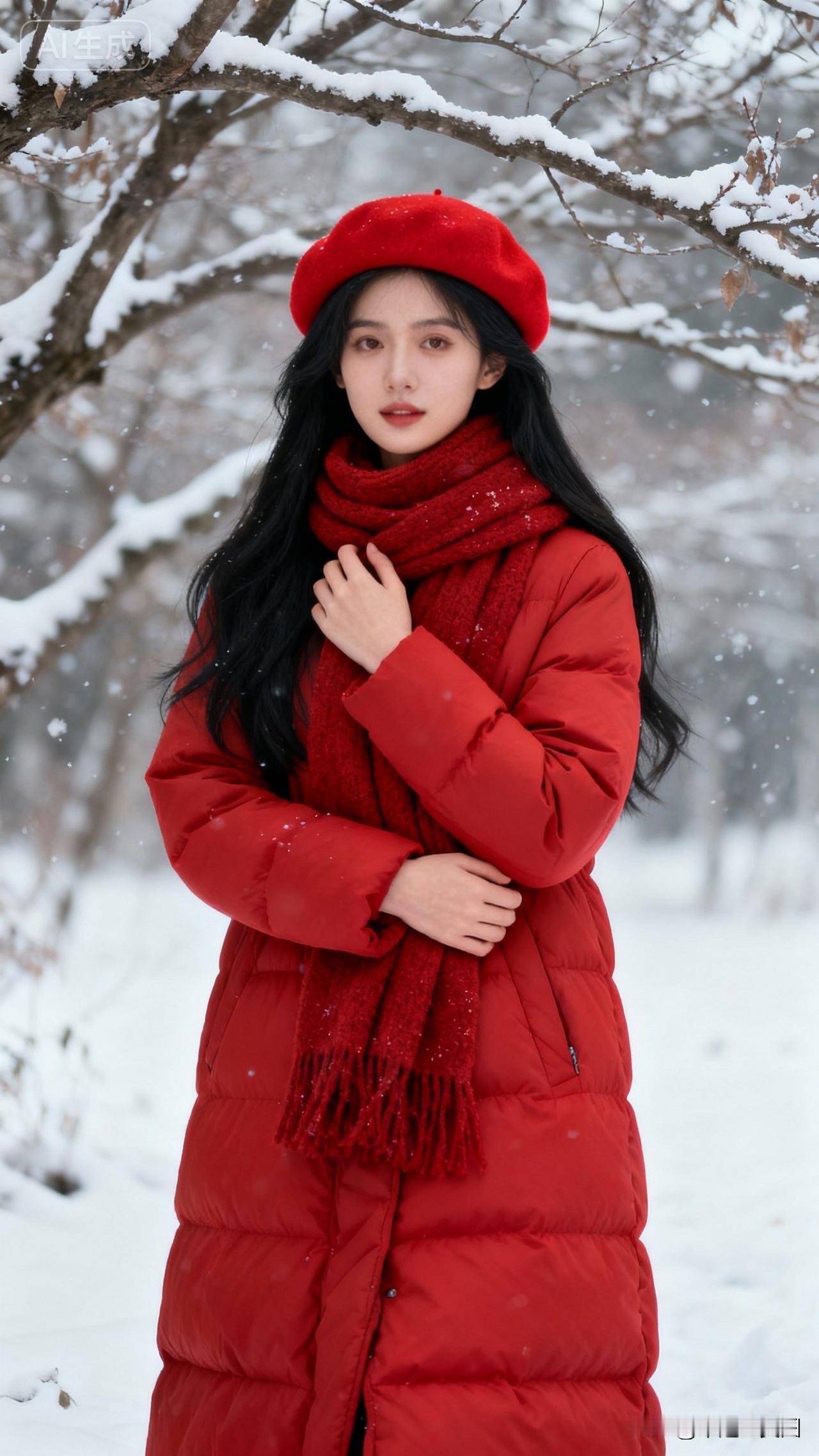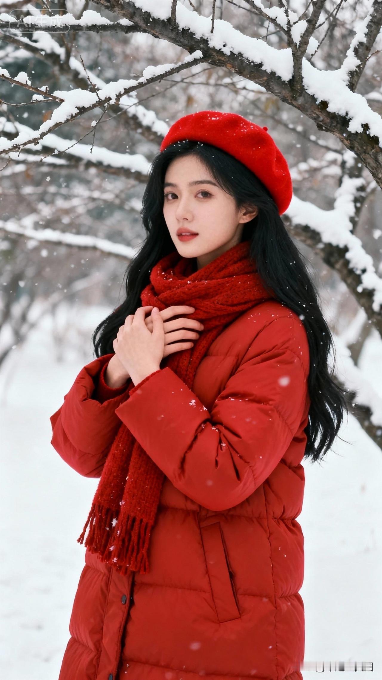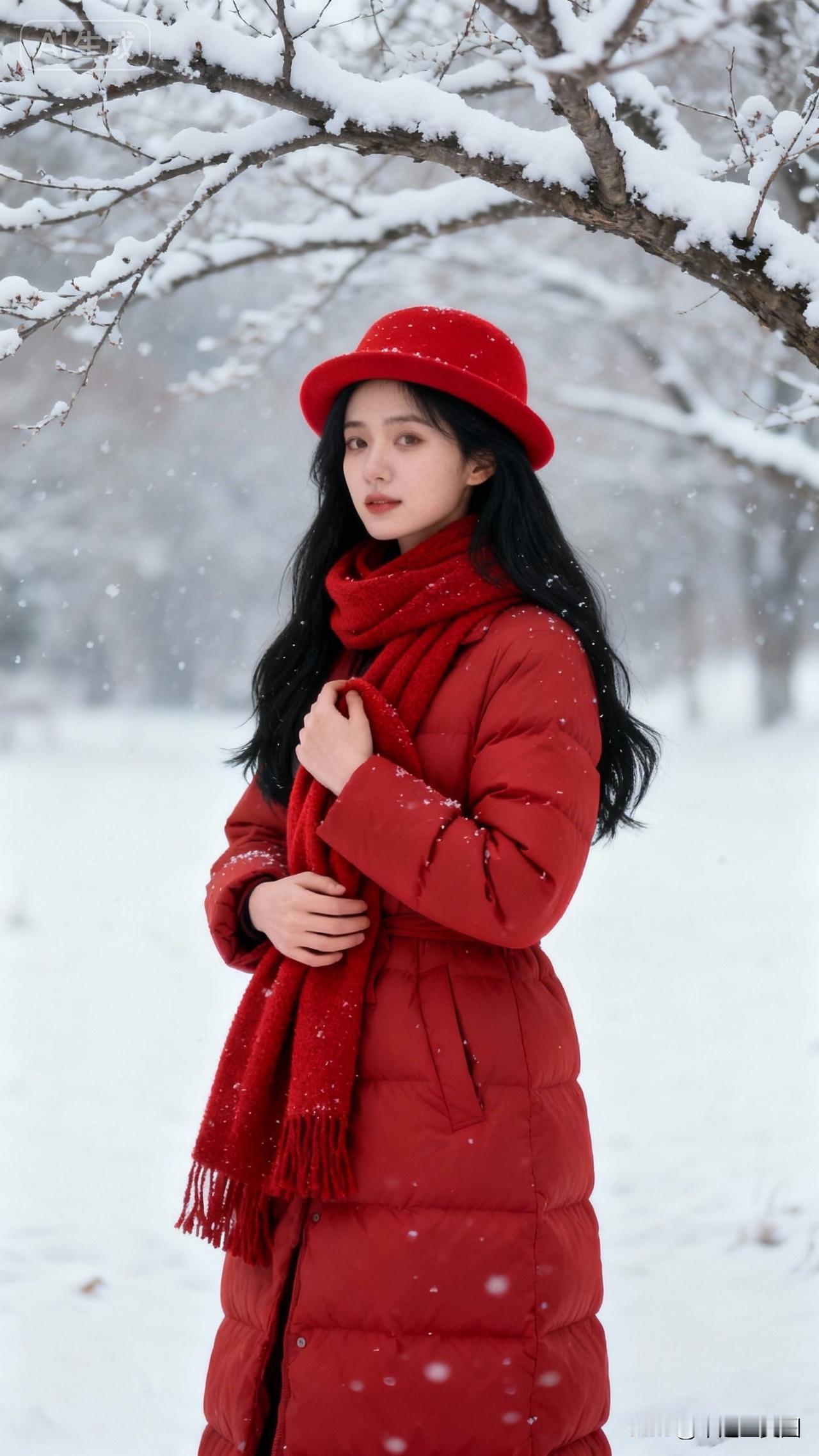 冬日雪景中的红衣少女,温暖如火,美不胜收。