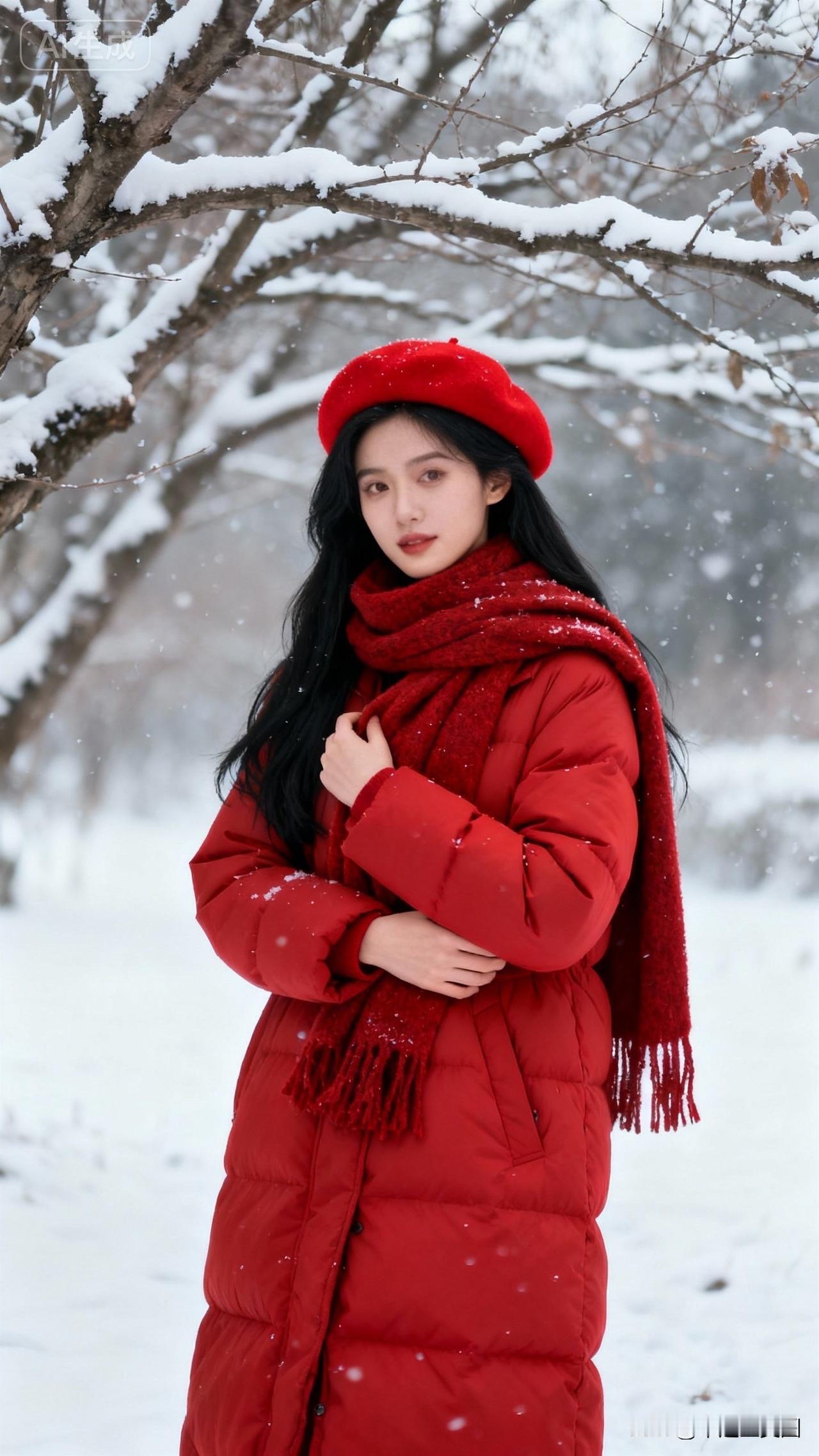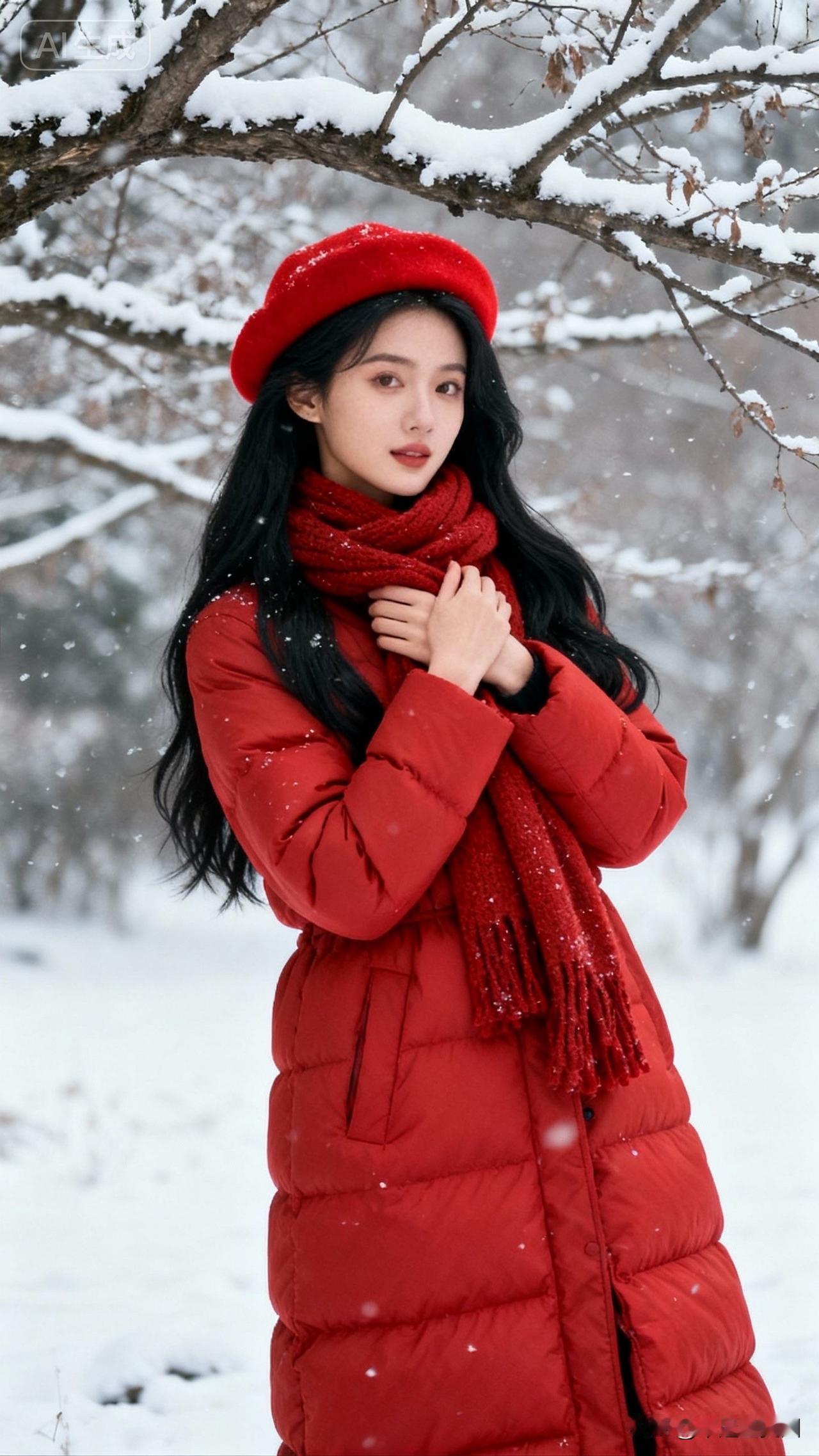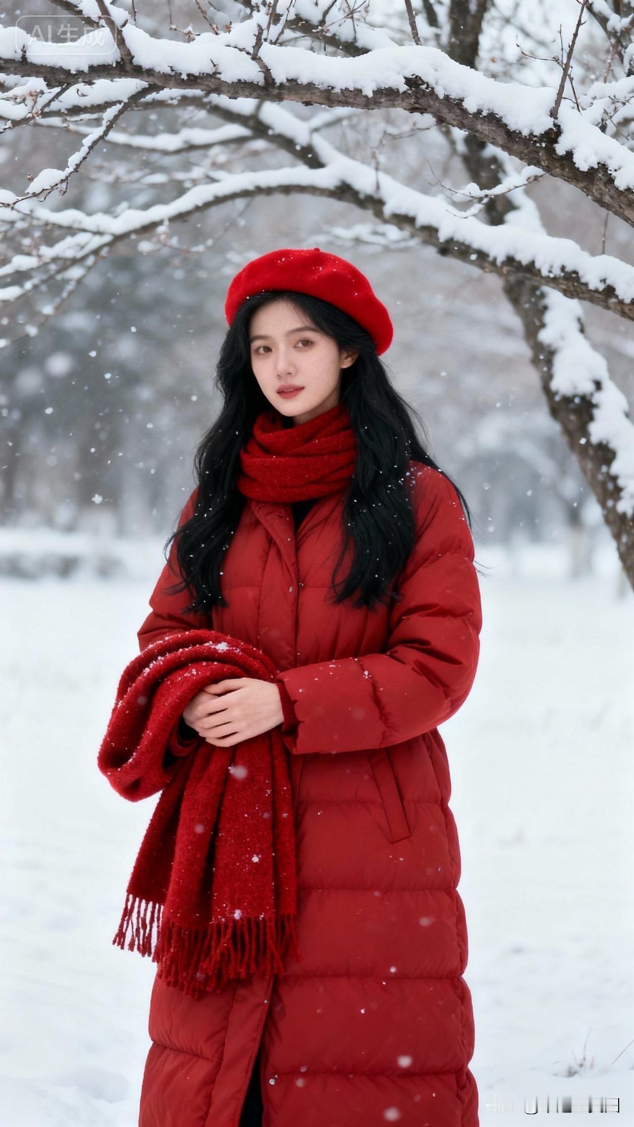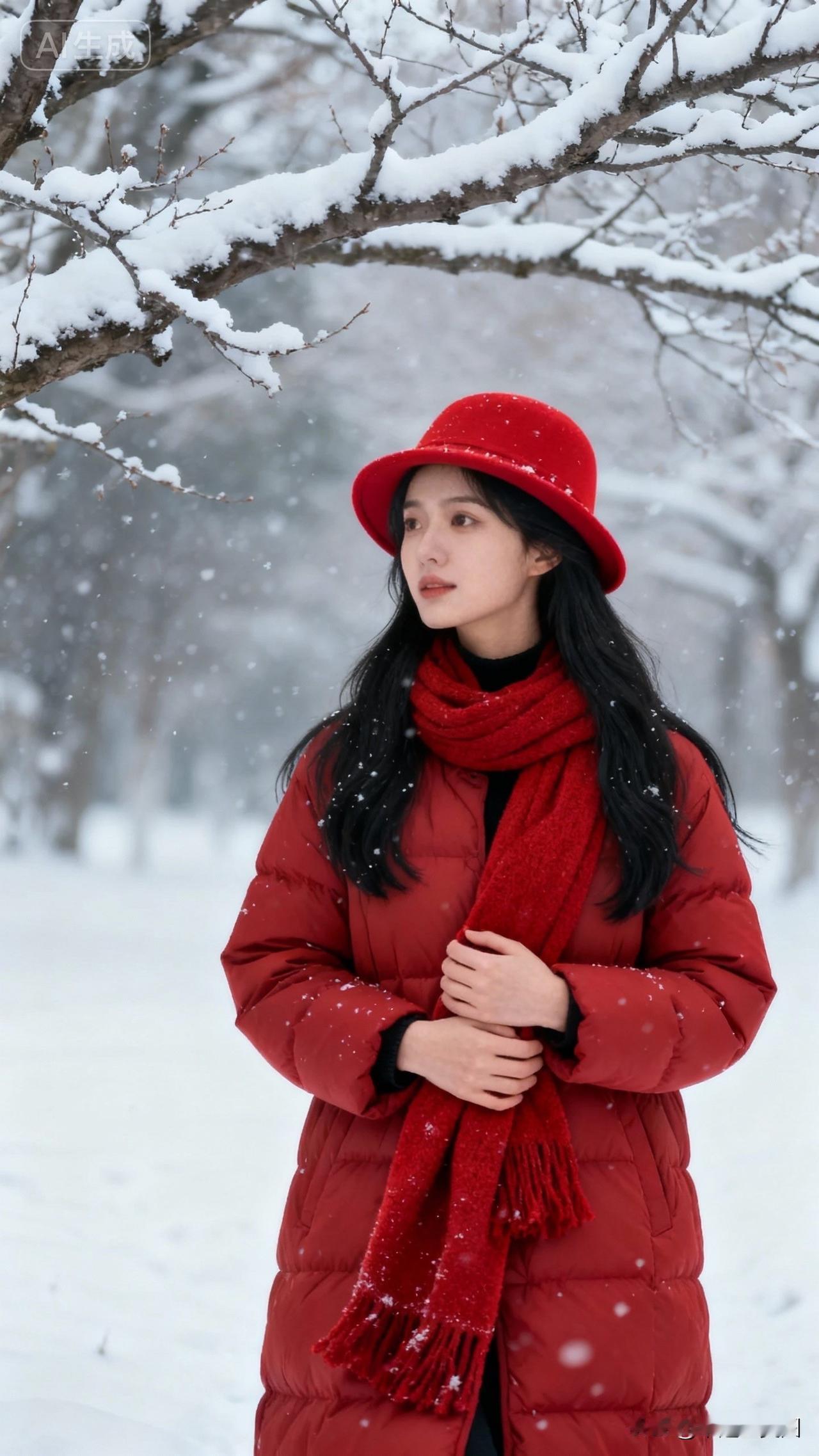 冬日雪景中的红衣少女,温暖如火,美不胜收。