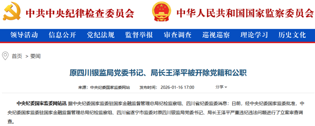 2026年1月16日,中央纪委国家监委网站的一则通报震动了金融圈:原四川银监局党委书记、局长王泽平被开除党籍和公职。这位曾在多个省份执掌银监系统的正厅级干部,其职业生涯以这样一种不光彩的方式画上句号。