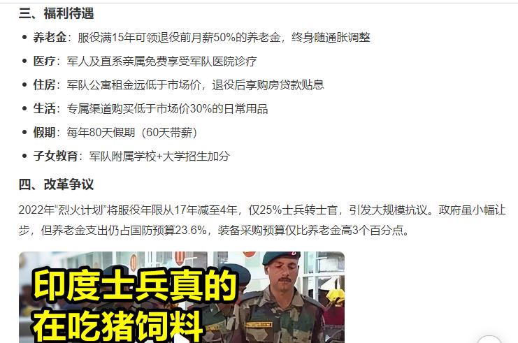 印度当兵是个好出路,因为薪水高! 印度每年在军队上的开支,2025年居然高达783亿美元,2026年要突破800亿美元水平。尤其是印度新兵的工资,最高能拿到6万卢比,约合近5000元人民币,这比印度普通员工的工资,高出来两三倍水平。所以印度在士兵待遇上的支出,确实非常大方。 印度士兵的待遇,不仅在印度国内,属于最高阶层,可能放到亚洲国家军队,也属于上层水平。要不然印度每年花费如此庞大的军费,因为印度士兵的工资水平更高。还有一点,印度军队有145万人,规模其实也不小,加上每年要给退休的印度官兵,发放大量福利待遇。 实际上光这些工资支,出就占印度总军费的不小的部分,导致印度军队在发展中,其实没有多少科研经费。尤其是印度官兵,服役年限很长,有一些人甚至可以服役一二十年,大家可以看到在中印加勒万河谷大战当中,有一些印度士兵,都已经四五十岁了,还在当兵。 这种军队职业化和终身化的制度,对印度军队来说,虽然不会形成很强的战斗力,但是也比较人性化,因为这代表着一人当兵,可以养活一大家子。因为印度兵的工资高,反正整个南亚地区,印度士兵的工资水平最高,毋庸置疑。 尤其是在高原地区执勤的印度官兵,工资水平最高,在南部轻松区域,那就低得很多。所以愿意上高原的印度官兵,还是挺多的,因为打仗的时候不常有,高原工资那是月月发。