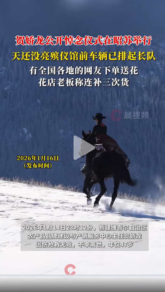 据新华社,1月11日15时许,因工作需要,贺娇龙在博乐市进行农产品电商销售活动前期拍摄时,意外坠马致头部严重受伤,随即被送往博州人民医院救治。博州党委、政府迅速安排,组织当地医疗资源全力抢救,并积极联系国内相关学科专家进行会诊,自治区卫健委选派专家赶赴当地参加抢救。1月13日,贺娇龙转入新疆医科大学第一附属医院接受重症医学救治,1月14日,因伤势过重,抢救无效,不幸离世。