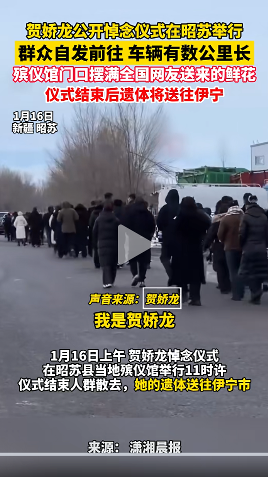 据潇湘晨报消息,1月16日上午,贺娇龙悼念仪式在昭苏县当地殡仪馆举行。11时许,仪式结束人群散去,她的遗体送往伊宁市。