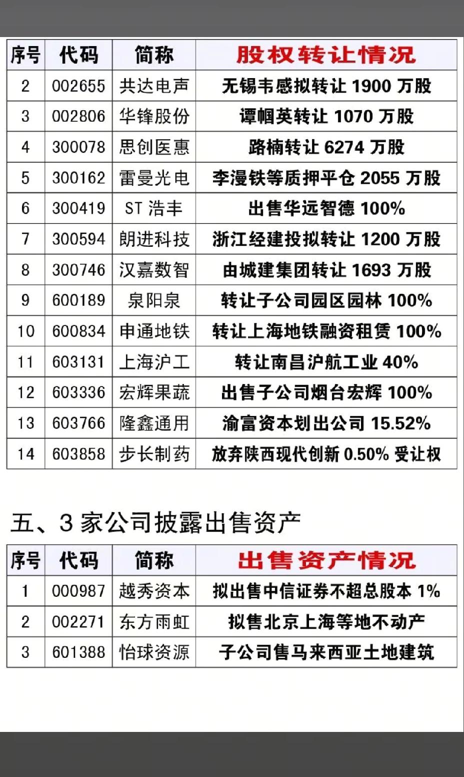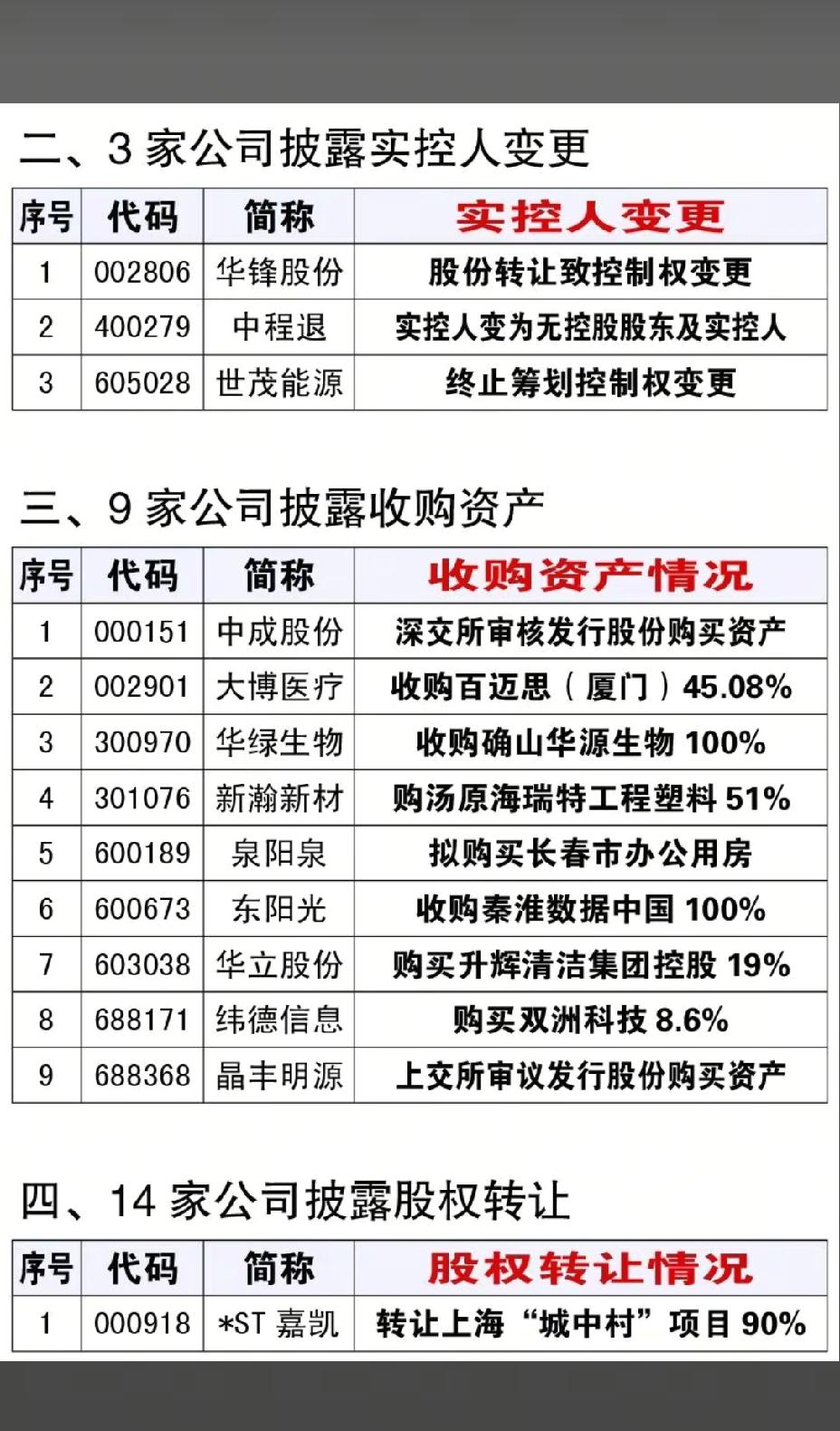 1月17日,下周A股这些股票有望大爆发!!! 14家公司披露资产重组事项,重点关注:华天科技购买华羿微电子100%进展,后市值得高看一眼;通业科技拟现金购买思凌科91.69%进展,后市值得期待;3家公司披露实控人变更;9家公司披露收购资产;14家公司披露股权转让;3家公司披露出售资产!!!