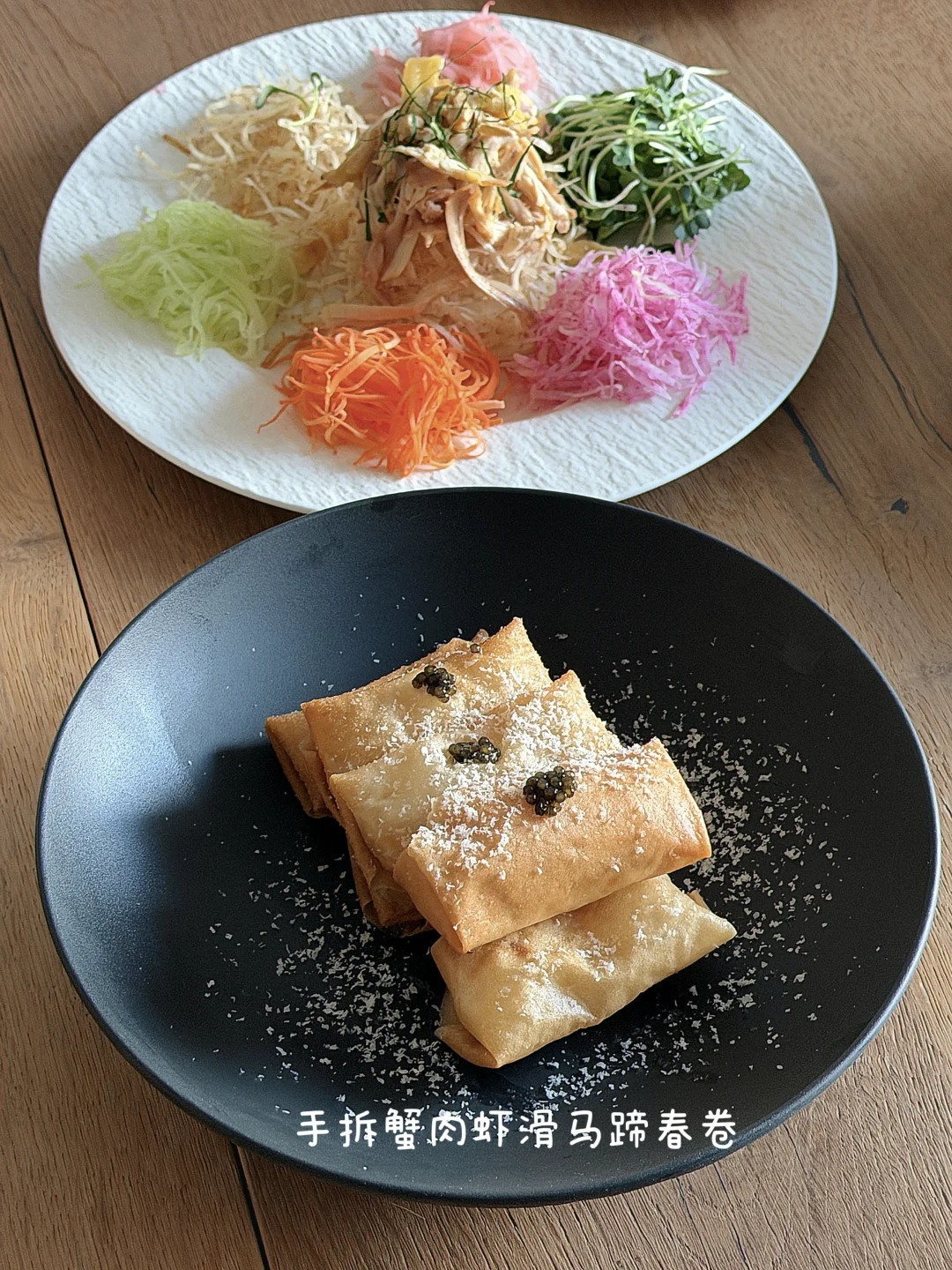 手拆蟹肉马蹄虾滑春卷(松叶蟹肉、虾滑、马蹄碎、奶酪碎、鱼子酱)