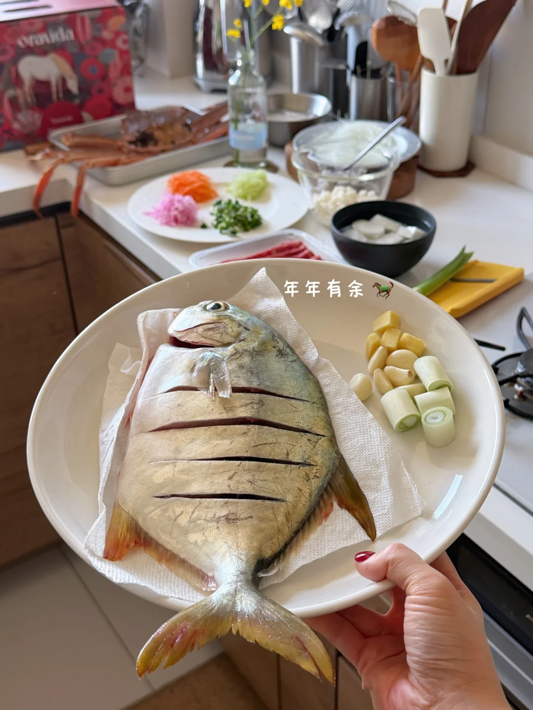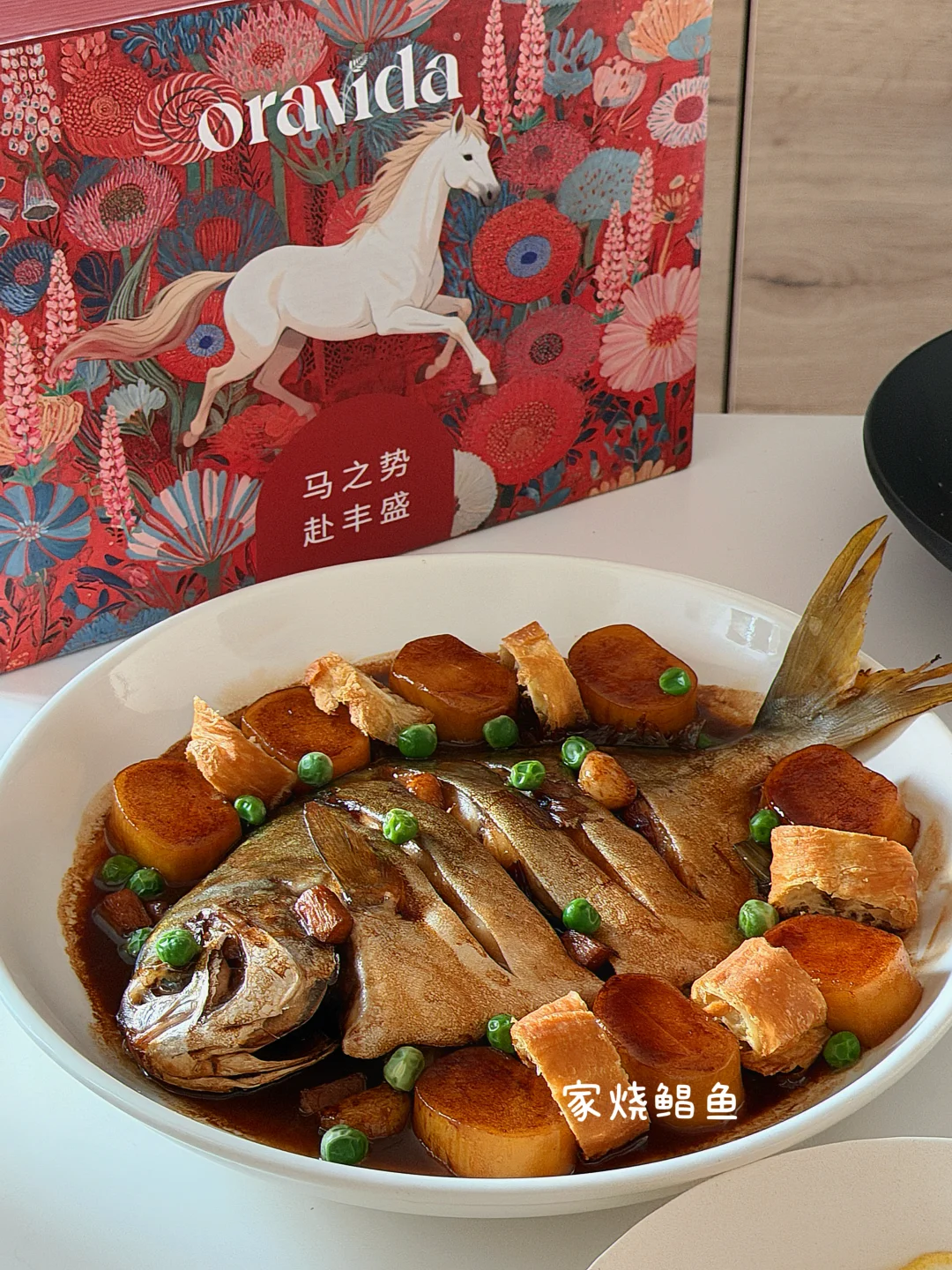 家烧鲳鱼(猪油、葱姜蒜、鲳鱼、年糕、豌豆、油条)