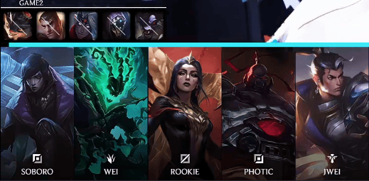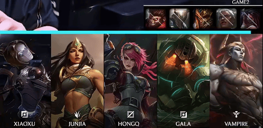 JDG选用:Xiaoxu塞恩;JunJia赵信;HongQ妖姬;GALA厄斐琉斯;Vampire锤石