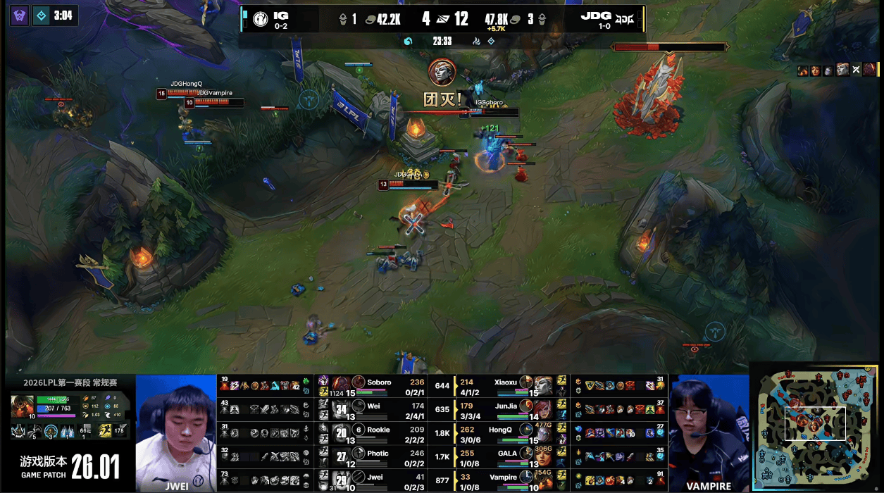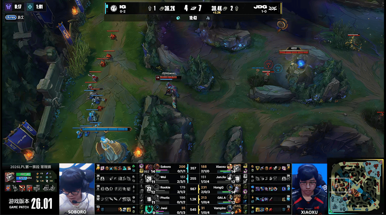 虎扑01月17日讯GAME2:IG蓝色方;JDG红色方