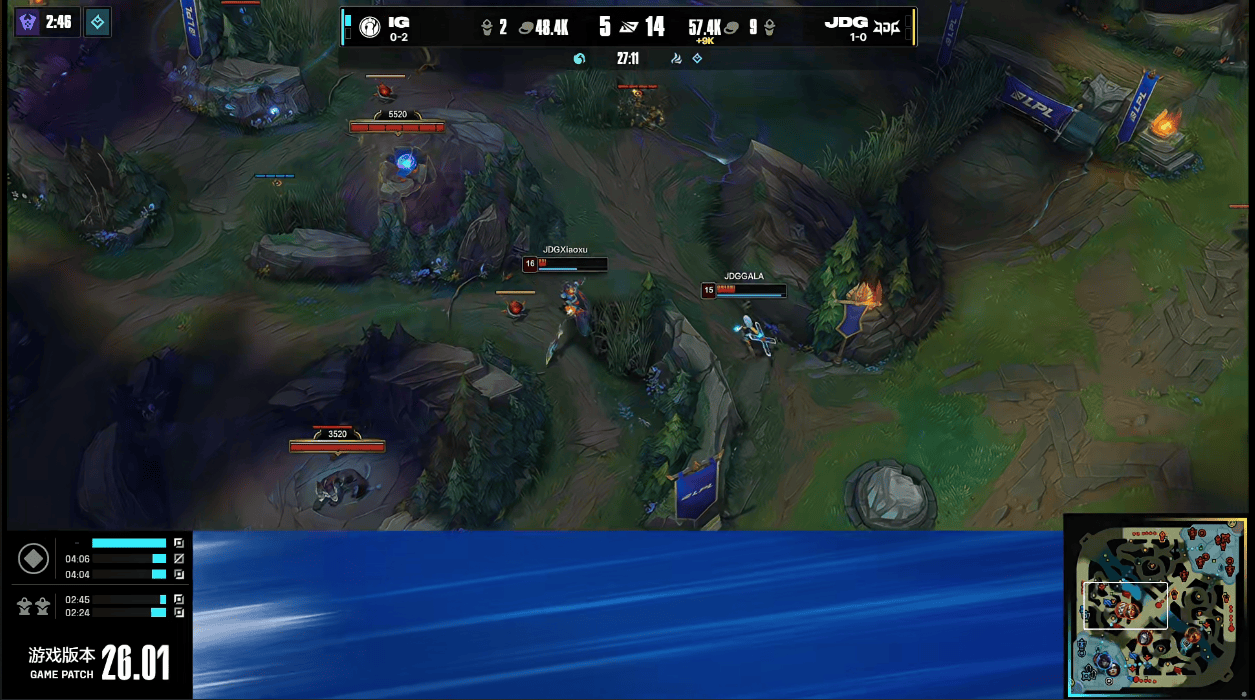 26分钟,JDG携带大龙Buff强行拆掉IG门牙塔