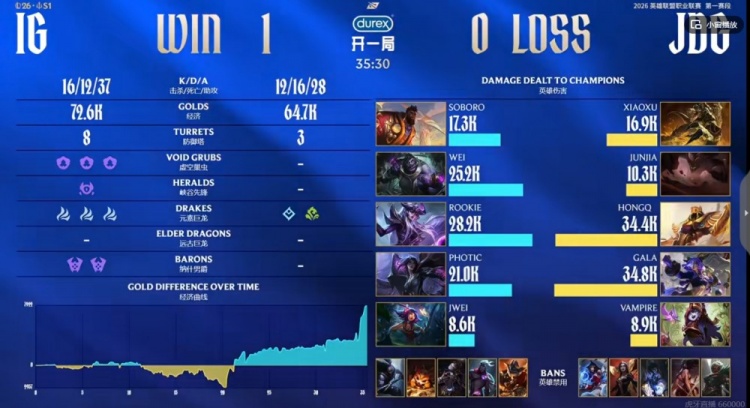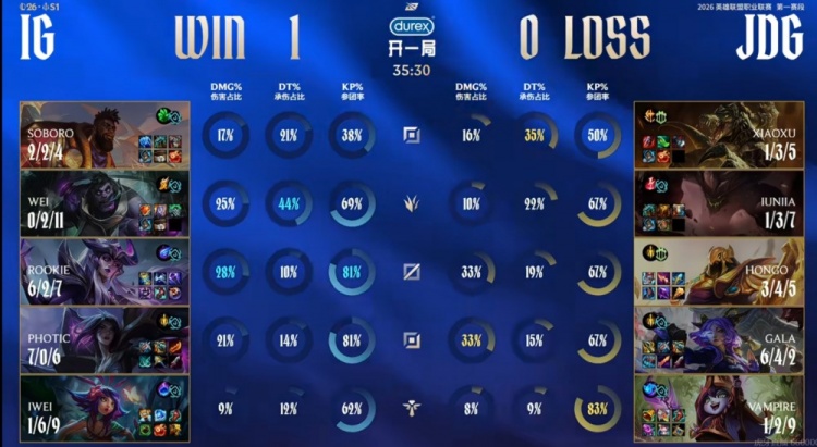 第一局比赛Rookie辛德拉对位压制HongQ沙皇,两边的AD在前期都成功团战拿下击杀!中期AL借助运营帮助HongQ沙皇补充经济,GALA芸阿娜也是连续拼命输出顶住了局势!但是iG依靠Jwei妮蔻连续完美开团掌握局势,小龙给到了JDG压力!决胜大龙团Rookie辛德拉抢大龙成功+随后金身+闪现拉扯到了Xiaoxu鳄鱼,他输出拉满配合Photic卡莎完成残局的收割!iG团灭JDG先拿一分!